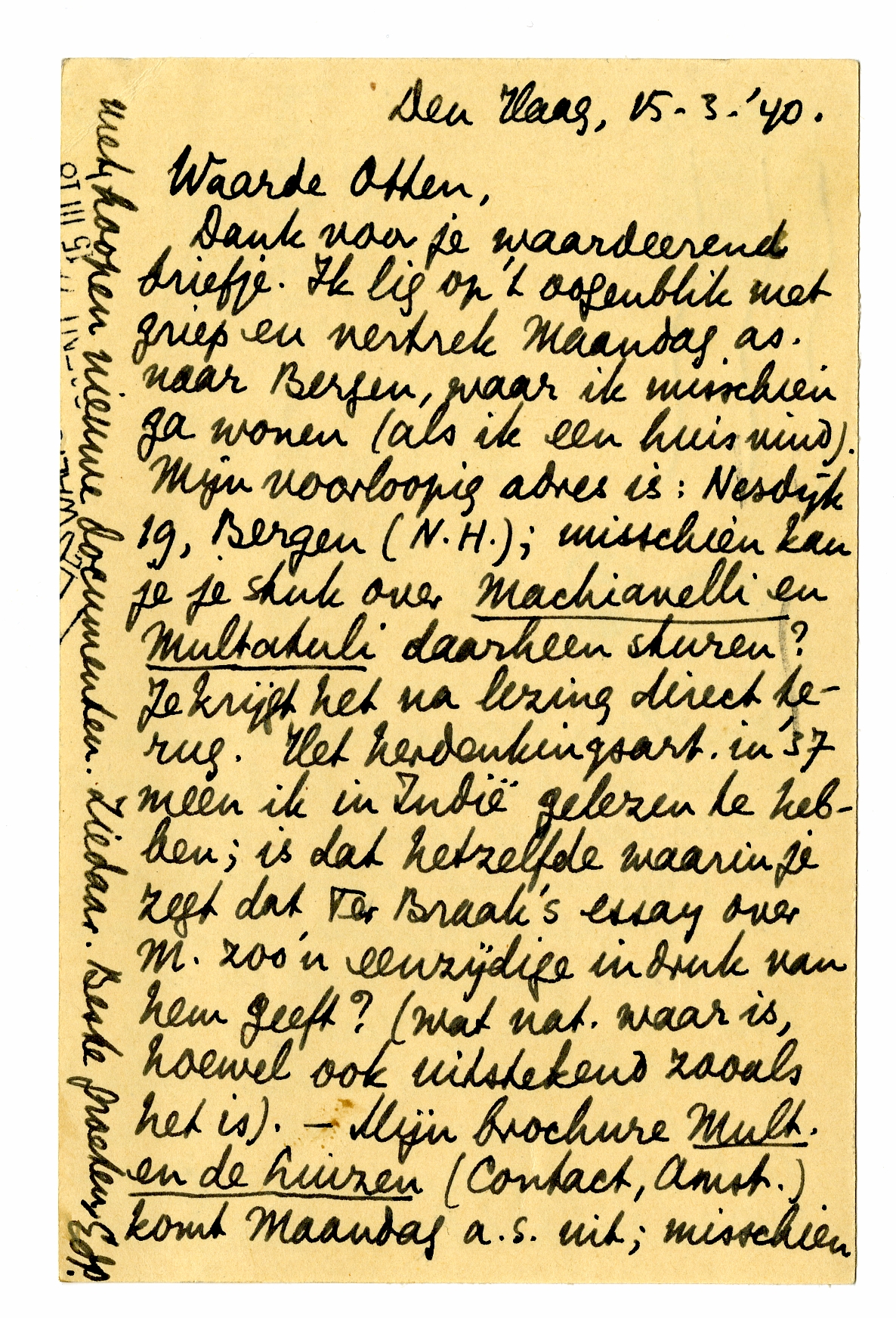 Dank voor je waardeerend briefje. Ik lig op 't oogenblik met griep en vertrek Maandag as. naar Bergen, waar ik misschien ga wonen (als ik een huis vind). Mijn voorloopig adres is: Nesdijk 19, Bergen (N.H.); misschien kan je je stuk over Machiavelli en Multatuli6844 daarheen sturen? Je krijgt het na lezing direct terug. Het herdenkingsart. in '376845 meen ik in Indië gelezen te hebben; is dat hetzelfde waarin je zegt dat Ter Braak's essay over M. zoo'n eenzijdige indruk van hem geeft? (wat nat. waar is, hoewel ook uitstekend zooals het is). - Mijn brochure Mult. en de Luizen (Contact, Amst.) komt Maandag a.s. uit; misschien kun je een recensie-ex. vragen. Ik denk dat het je hier en daar amuseeren zal; het stuk in G.N. was er een fragment uit. Lees verder ook wat de nationaalpatser Haighton over Mult. gedirkt heeft in het Mrt.-nr. van De Nwe Gids (als op bestelling); dat is héél geslaagd in het drekkige. Verder komt bij Stols van mij binnenkort: De Bewijzen uit het Pak v. Sjaalman met hoopen nieuwe documenten. Ziedaar. Beste groeten,