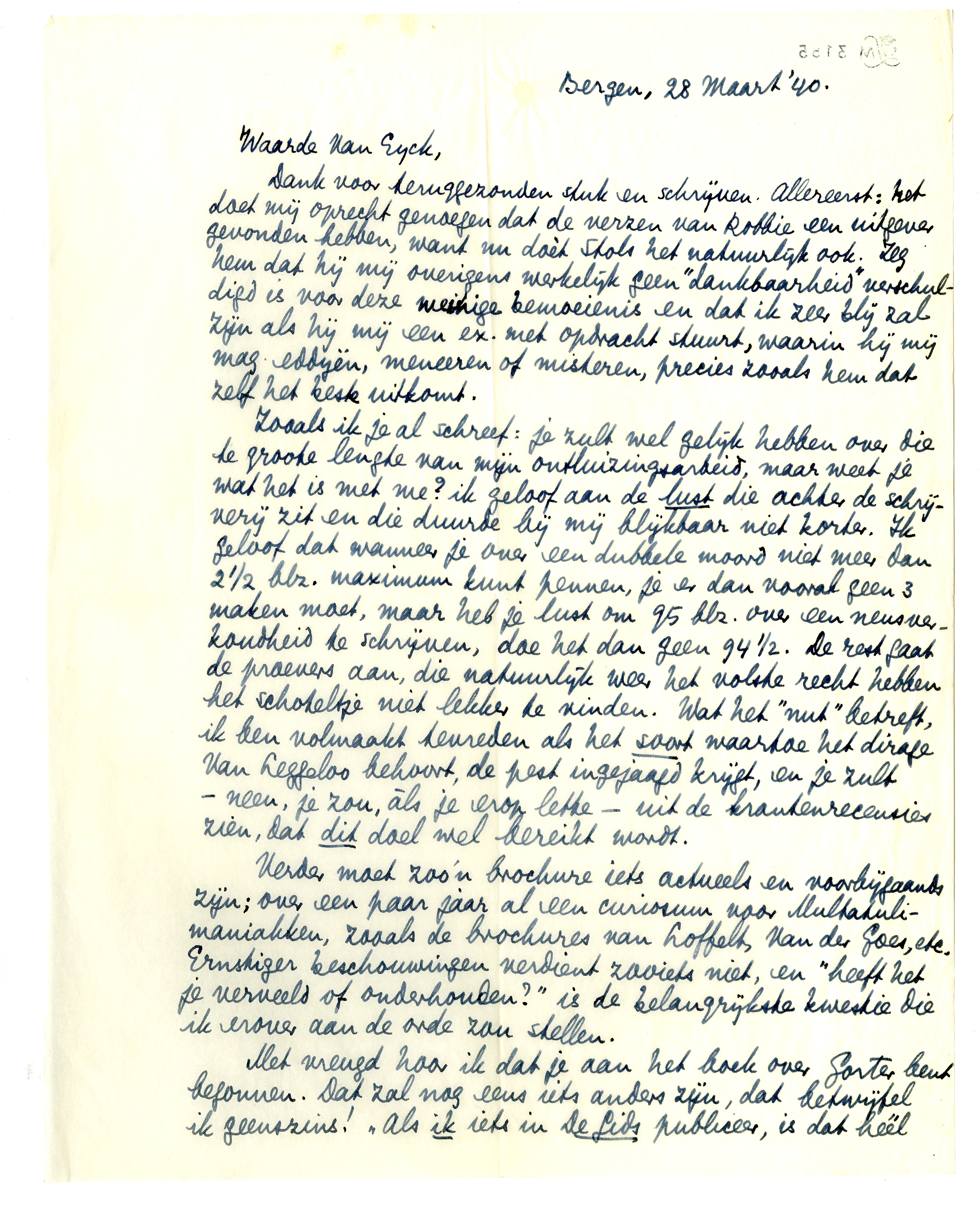 Dank voor teruggezonden stuk en schrijven. Allereerst: het doet mij oprecht genoegen dat de verzen van Robbie een uitgever gevonden hebben, want nu doèt Stols het natuurlijk ook. Zeg hem dat hij mij overigens werkelijk geen ‘dankbaarheid’ verschuldigd is voor deze weinige bemoeienis en dat ik zeer blij zal zijn als hij mij een ex. met opdracht stuurt, waarin hij mij mag eddyën, meneeren of misteren, precies zooals hem dat zelf het beste uitkomt.