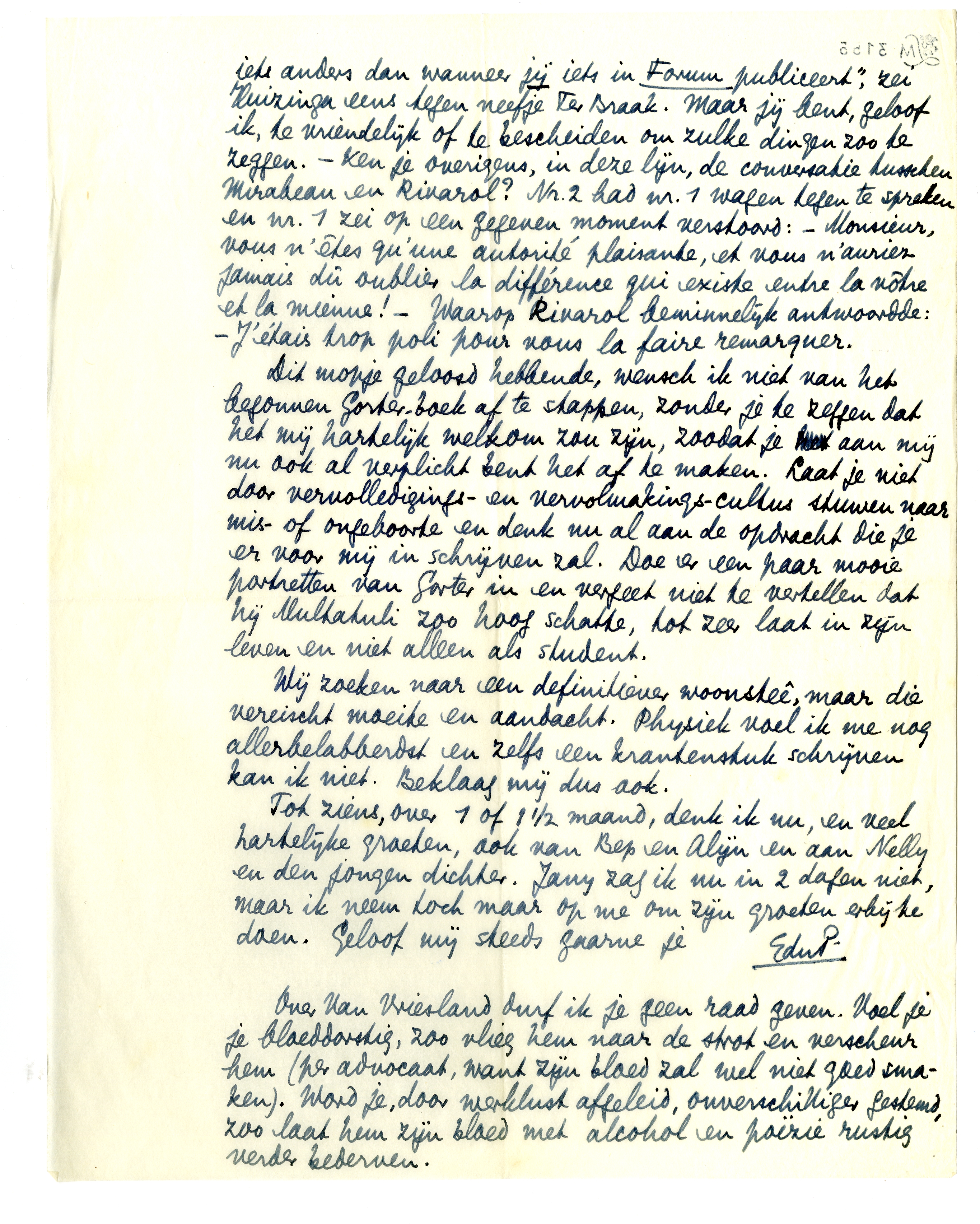 Met vreugd hoor ik dat je aan het boek over Gorter bent begonnen.6860 Dat zal nog eens iets anders zijn, dat betwijfel ik geenszins! ‘Als ik iets in De Gids publiceer, is dat héél iets anders dan wanneer jij iets in Forum publiceert’, zei Huizinga eens tegen neefje Ter Braak. Maar jij bent, geloof ik, te vriendelijk of te bescheiden om zulke dingen zoo te zeggen. - Ken je overigens, in deze lijn, de conversatie tusschen Mirabeau en Rivarol? Nr. 2 had nr. 1 wagen tegen te spreken en nr. 1 zei op een gegeven moment verstoord: - Monsieur, vous n'êtes qu'une autorité plaisante, et vous n'auriez jamais dû oublier la différence qui existe entre la vôtre et la mienne! - Waarop Rivarol beminnelijk antwoordde: - J'étais trop poli pour vous la faire remarquer.6861