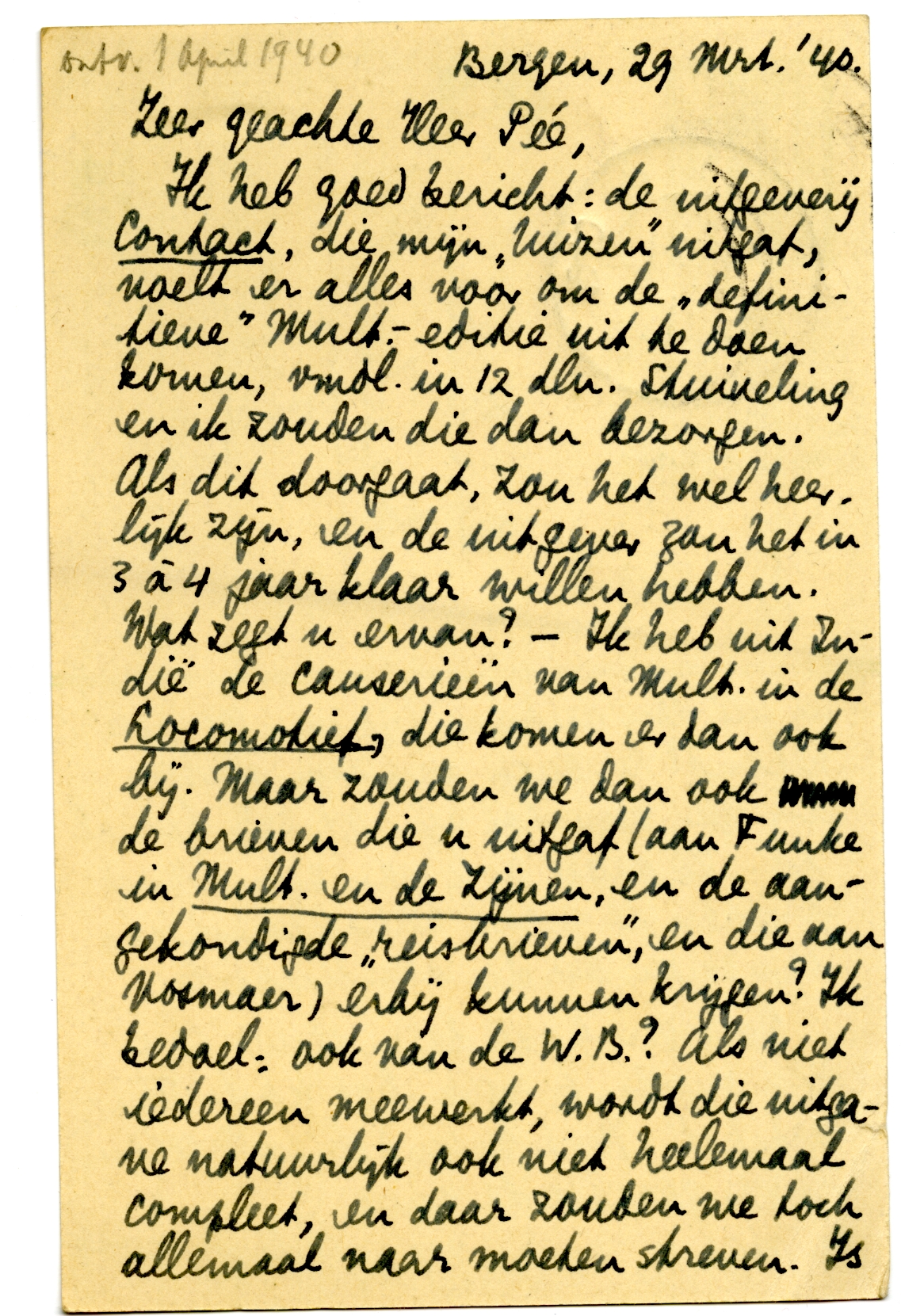 Ik heb goed bericht: de uitgeverij Contact, die mijn ‘luizen’ uitgaf, voelt er alles voor om de ‘definitieve’ Mult.-editie uit te doen komen, vmdl. in 12 dln. Stuiveling en ik zouden die dan bezorgen. Als dit doorgaat, zou het wel heerlijk zijn, en de uitgever zou het in 3 à 4 jaar klaar willen hebben. Wat zegt u ervan? - Ik heb uit Indië de causerieën van Mult. in de Locomotief, die komen er dan ook bij. Maar zouden we dan ook de brieven die u uitgaf (aan Funke in Mult. en de Zijnen, en de aangekondigde ‘reisbrieven’, en die aan Vosmaer) erbij kunnen krijgen? Ik bedoel: ook van de W.B.? Als niet iedereen meewerkt, wordt die uitgave natuurlijk ook niet heelemaal compleet, en daar zouden we toch allemaal naar moeten streven. Is u uit den oudsten tijd van M. iets bekend? Brieven aan zijn ouders en dgl., van tot zijn 21, 22e, bedoel ik. Ik wou ook van zijn dienstbrieven de meest karakteristieke opnemen, bv. die aan Michiels.6865