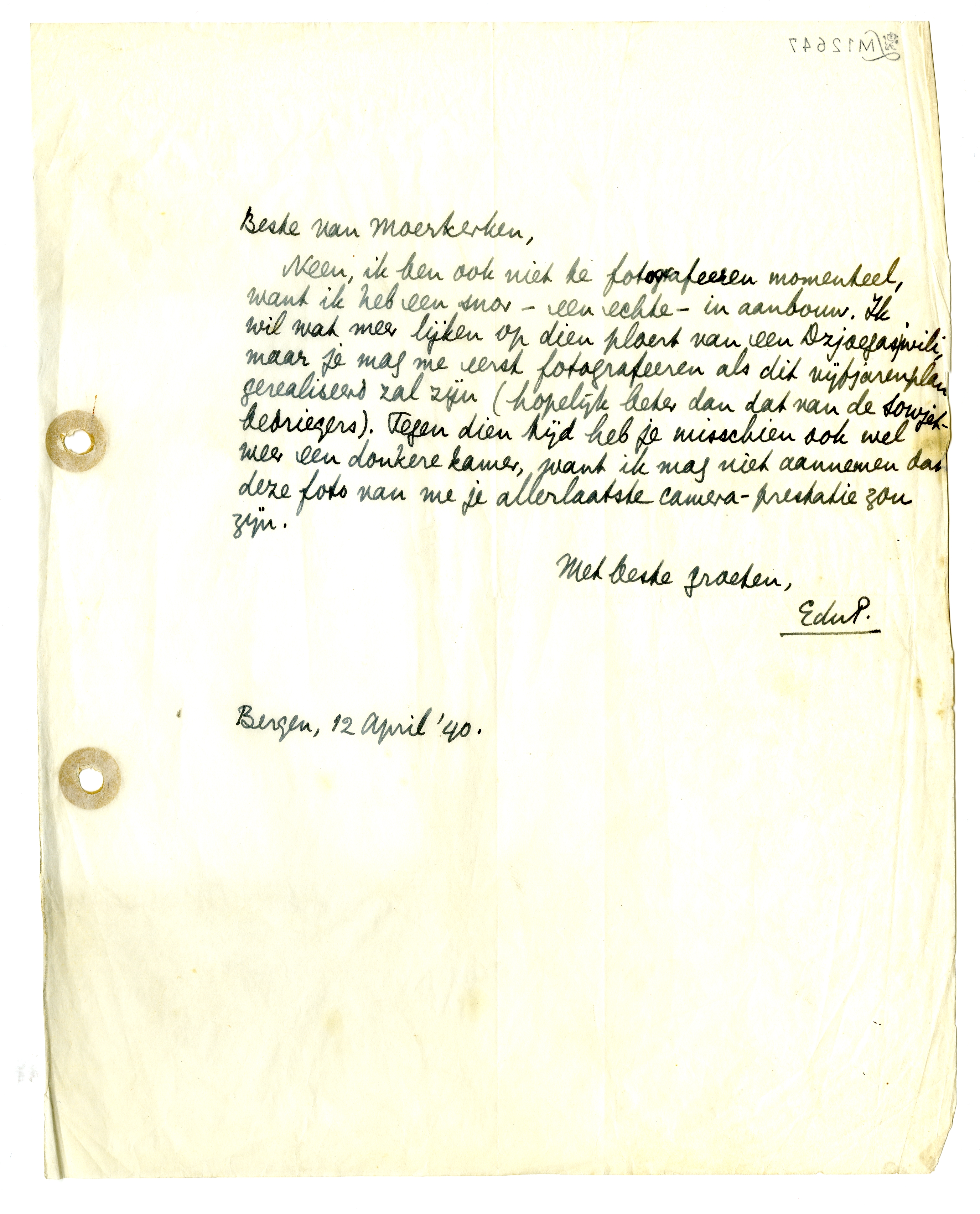 Neen, ik ben ook niet te fotografeeren momenteel, want ik heb een snor - een echte - in aanbouw. Ik wil wat meer lijken op dien ploert van een Dzjoegasjwili, maar je mag me eerst fotografeeren als dit vijfjarenplan gerealiseerd zal zijn (hopelijk beter dan dat van de Sowjet-bedriegers). Tegen dien tijd heb je misschien ook wel weer een donkere kamer, want ik mag niet aannemen dat deze foto van me je allerlaatste camera-prestatie zou zijn.