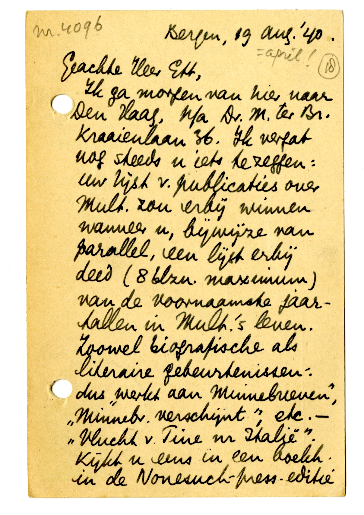 Ik ga morgen van hier naar Den Haag, p/a Dr. M. ter Br. Kraaienlaan 36. Ik vergat nog steeds u iets te zeggen: uw lijst v. publicaties over Mult. zou erbij winnen wanneer u, bijwijze van parallel, een lijst erbij deed (8 blzn. maximum) van de voornaamste jaartallen in Mult.'s leven. Zoowel biografische als literaire gebeurtenissen: dus ‘werkt aan Minnebrieven’, ‘Minnebr. verschijnt’, etc. - ‘Vlucht v. Tine nr Italië’. Kijkt u eens in een boekh. in de Nonesuch-press-editie van Thomas de Quincey,6951 daar voorin staat zoo'n lijst die u als model kan dienen. Het zou werkelijk de waarde van uw boekje verdubbelen.