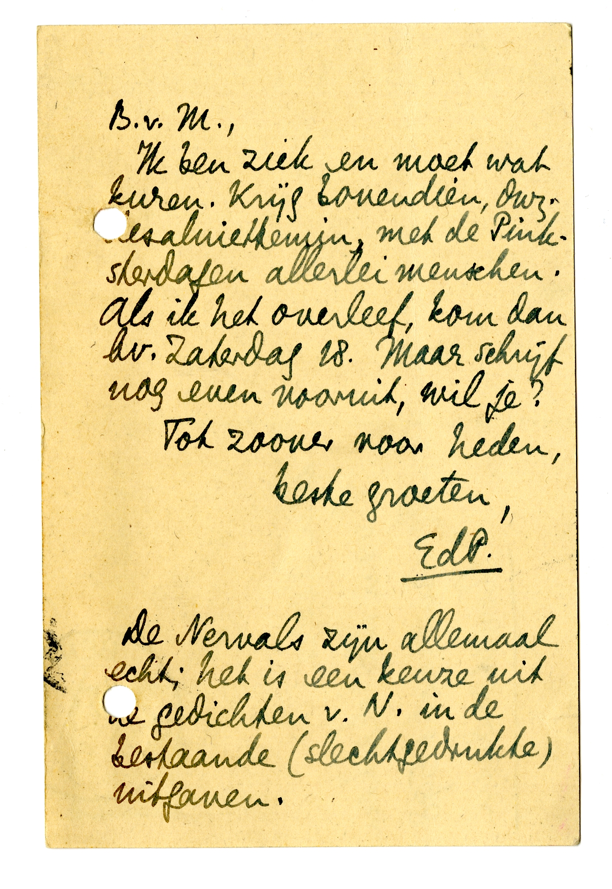 Ik ben ziek en moet wat kuren. Krijg bovendien, dwz. desalniettemin, met de Pinksterdagen allerlei menschen. Als ik het overleef, kom dan bv. Zaterdag 18. Maar schrijf nog even vooruit, wil je?