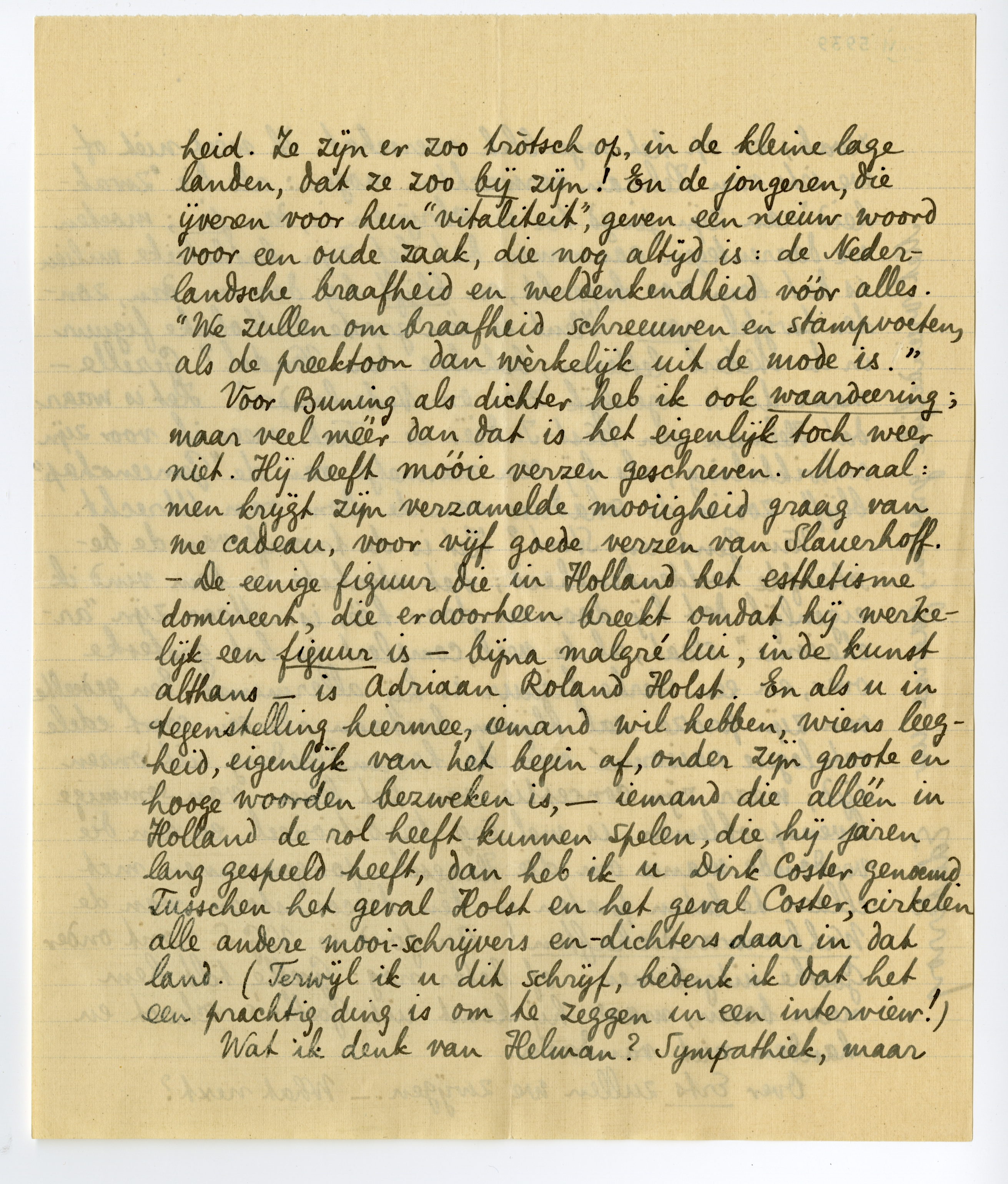 Voor Buning7034 als dichter heb ik ook waardeering; maar veel méér dan dat is het eigenlijk toch weer niet. Hij heeft móóie verzen geschreven. Moraal: men krijgt zijn verzamelde mooiigheid graag van me cadeau, voor vijf goede verzen van Slauerhoff.7035 - De eenige figuur die in Holland het esthetisme domineert, die er doorheen breekt omdat hij werkelijk een figuur is - bijna malgré lui, in de kunst althans - is Adriaan Roland Holst. En als u in tegenstelling hiermee, iemand wil hebben, wiens leegheid, eigenlijk van het begin af, onder zijn groote en hooge woorden bezweken is, - iemand die alléén in Holland de rol heeft kunnen spelen, die hij jaren lang gespeeld heeft, dan heb ik u Dirk Coster genoemd. Tusschen het geval Holst en het geval Coster, cirkelen alle andere mooi-schrijvers en -dichters daar in dat land. (Terwijl ik u dit schrijf, bedenk ik dat het een prachtig ding is om te zeggen in een interview!)