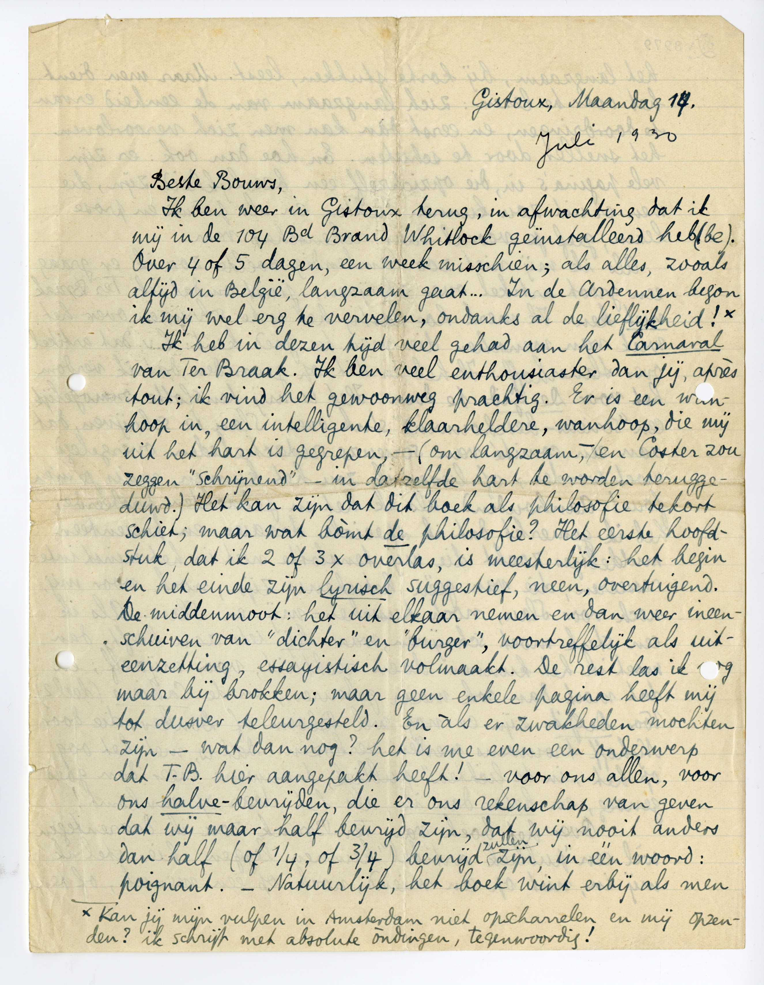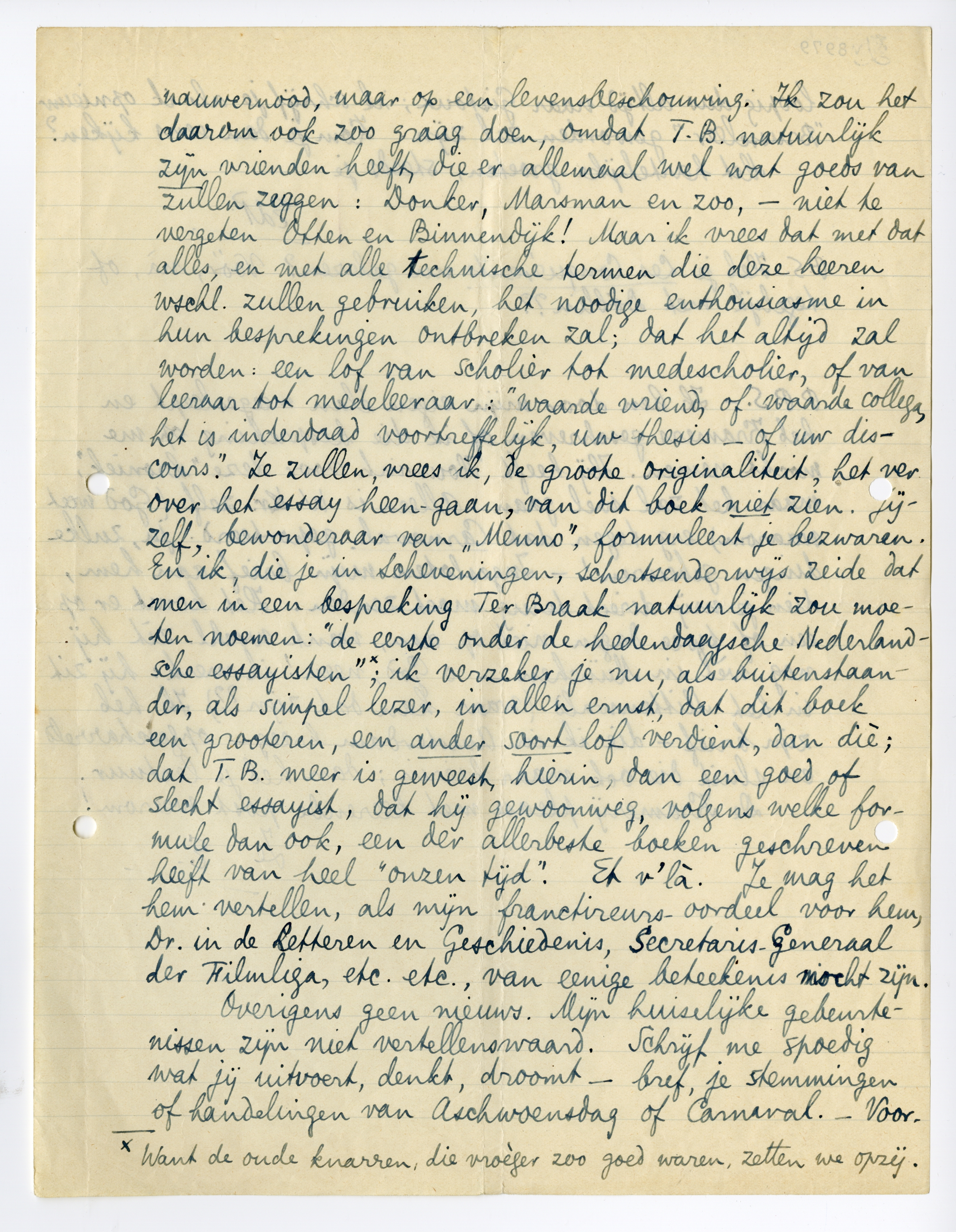 Over het boek van Ter Braak zou ik daarentegen wèl een ‘publiek artikel’ kunnen leggen: hier stel ik mij in, niet op een vriend, noch op een mensch, of ternauwernood, maar op een levensbeschouwing. Ik zou het daarom ook zoo graag doen, omdat T.B. natuurlijk zijn vrienden heeft, die er allemaal wel wat goeds van zullen zeggen: Donker, Marsman en zoo, - niet te vergeten Otten en Binnendijk! Maar ik vrees dat met dat alles, en met alle technische termen die deze heeren wschl. zullen gebruiken, het noodige enthousiasme in hun besprekingen ontbreken zal; dat het altijd zal worden: een lof van scholier tot medescholier, of van leeraar tot medeleeraar: ‘waarde vriend, of waarde collega, het is inderdaad voortreffelijk, uw thesis - of uw discours’. Ze zullen, vrees ik, de groote originaliteit, het ver over het essay heen-gaan, van dit boek niet zien. Jijzelf, bewonderaar van ‘Menno’, formuleert je bezwaren. En ik, die je in Scheveningen, schertsenderwijs zeide dat men in een bespreking Ter Braak natuurlijk zou moeten noemen: ‘de eerste onder de hedendaagsche Nederlandsche essayisten’*; ik verzeker je nu, als buitenstaander, als simpel lezer, in allen ernst, dat dit boek een grooteren, een ander soort lof verdient, dan diè; dat T.B. meer is geweest, hierin, dan een goed of slecht essayist, dat hij gewoonweg, volgens welke formule dan ook, een der allerbeste boeken geschre-ven heeft van heel ‘onzen tijd’. Et v'là. Je mag het hem vertellen, als mijn franctireurs-oordeel voor hem, Dr. in de Letteren en Geschiedenis, Secretaris-Generaal der Filmliga, etc. etc., van eenige beteekenis mocht zijn.
