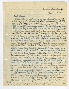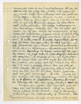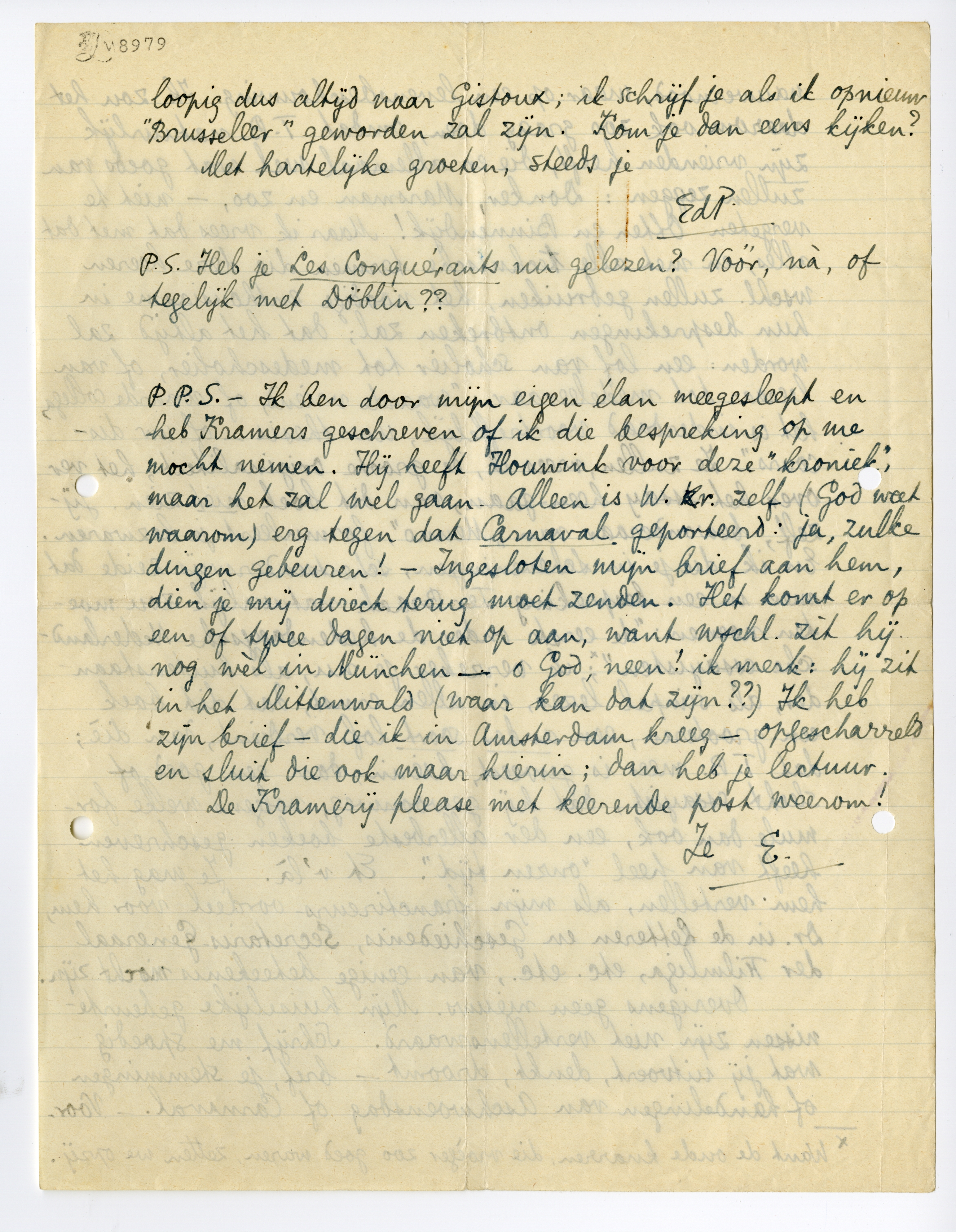 P.P.S. - Ik ben door mijn eigen élan meegesleept en heb Kramers geschreven of ik die bespreking op me mocht nemen.7046 Hij heeft Houwink voor deze ‘kroniek’, maar het zal wel gaan. Alleen is W.Kr. zelf (God weet waarom) erg tegen dat Carnaval geporteerd: ja, zulke dingen gebeuren! - Ingesloten mijn brief aan hem, dien je mij direct terug moet zenden. Het komt er op een of twee dagen niet op aan, want wschl. zit hij nog wèl in München - o God, neen! ik merk: hij zit in het Mittenwald (waar kan dat zijn??) Ik heb zijn brief - die ik in Amsterdam kreeg - opgescharreld en sluit die ook maar hierin; dan heb je lectuur.