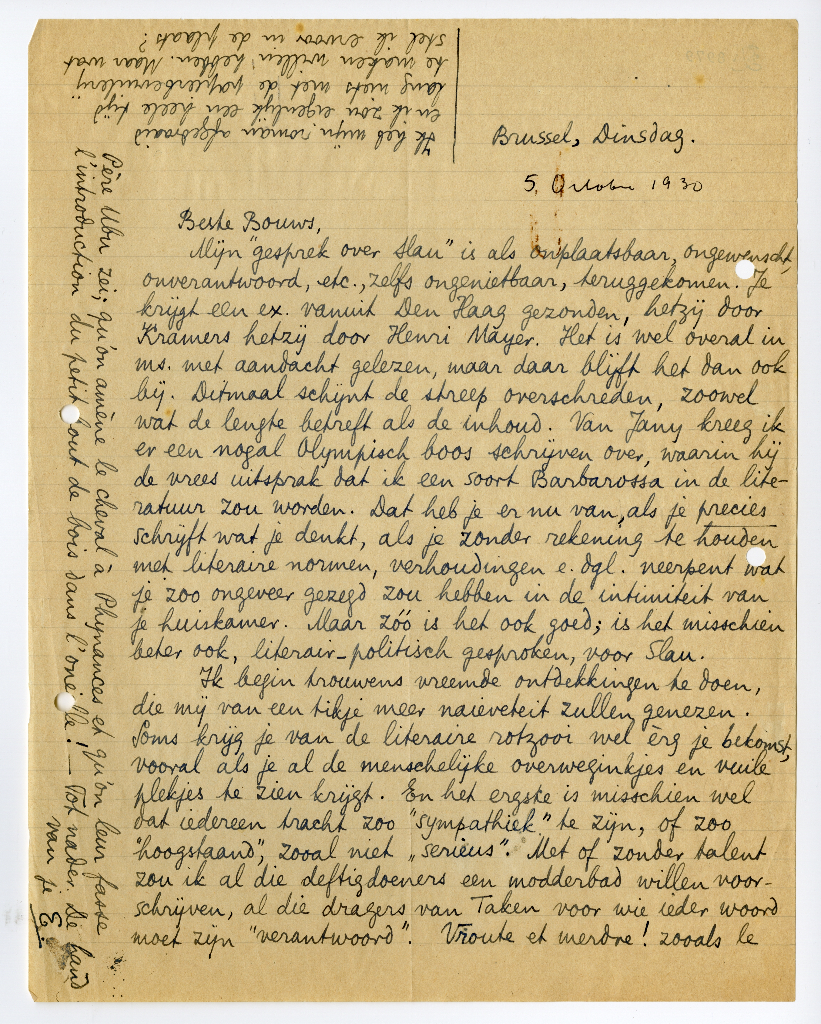 Mijn ‘gesprek over Slau’ is als onplaatsbaar, ongewenscht, onverantwoord, etc., zelfs ongenietbaar, teruggekomen. Je krijgt een ex. vanuit Den Haag gezonden, hetzij door Kramers hetzij door Henri Mayer. Het is wel overal in ms. met aandacht gelezen, maar daar blijft het dan ook bij. Ditmaal schijnt de streep overschreden, zoowel wat de lengte betreft als de inhoud. Van Jany kreeg ik er een nogal Olympisch boos schrijven over, waarin hij de vrees uitsprak dat ik een soort Barbarossa7049 in de literatuur zou worden.7050 Dat heb je er nu van, als je precies schrijft wat je denkt, als je zonder rekening te houden met literaire normen, verhoudingen e.dgl. neerpent wat je zoo ongeveer gezegd zou hebben in de intimiteit van je huiskamer. Maar zóó is het ook goed; is het misschien beter ook, literair-politisch gesproken, voor Slau.
