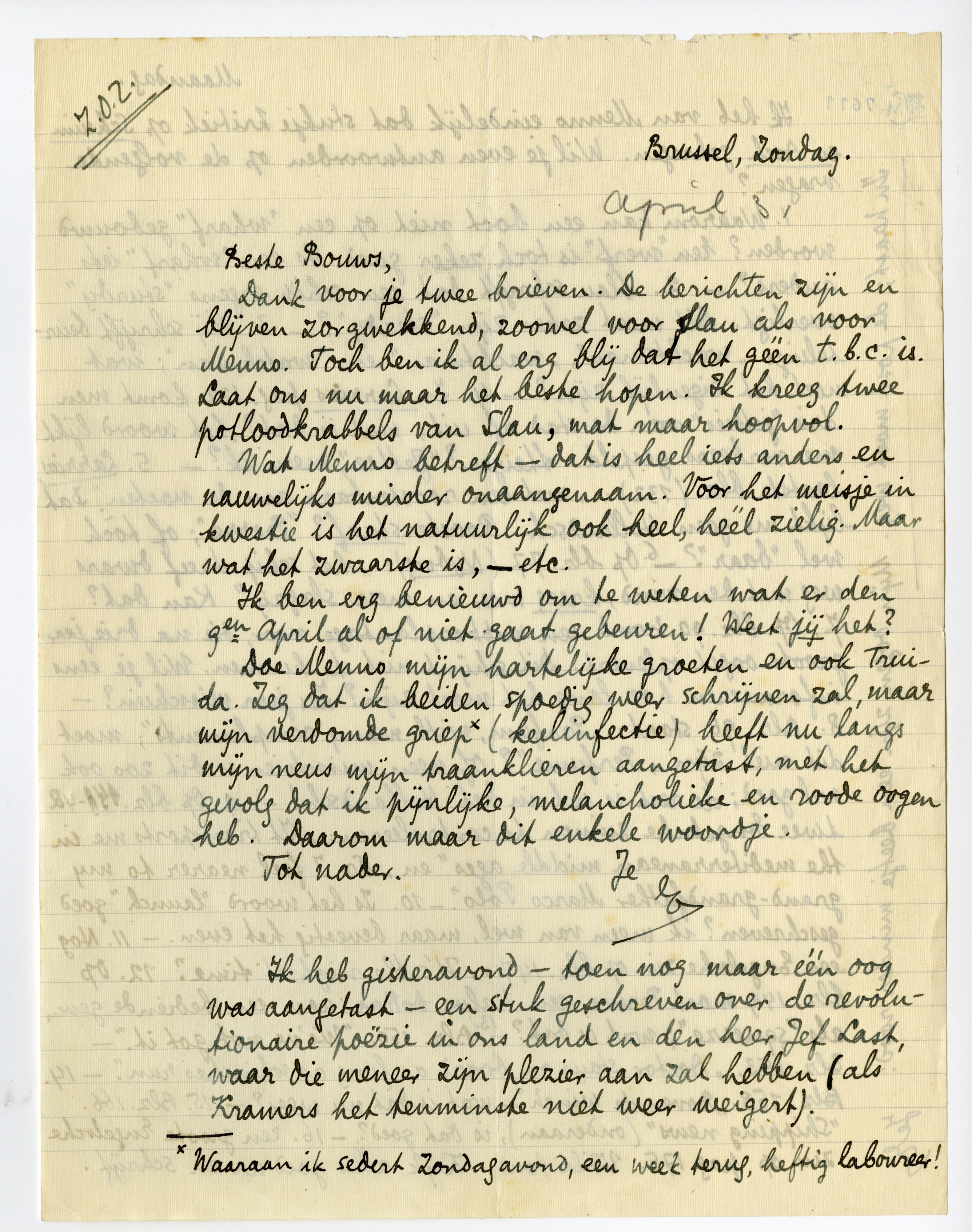 Dank voor je twee brieven. De berichten zijn en blijven zorgwekkend, zoowel voor Slau als voor Menno. Toch ben ik al erg blij dat het géén t.b.c. is. Laat ons nu maar het beste hopen. Ik kreeg twee potloodkrabbels van Slau, mat maar hoopvol.7084