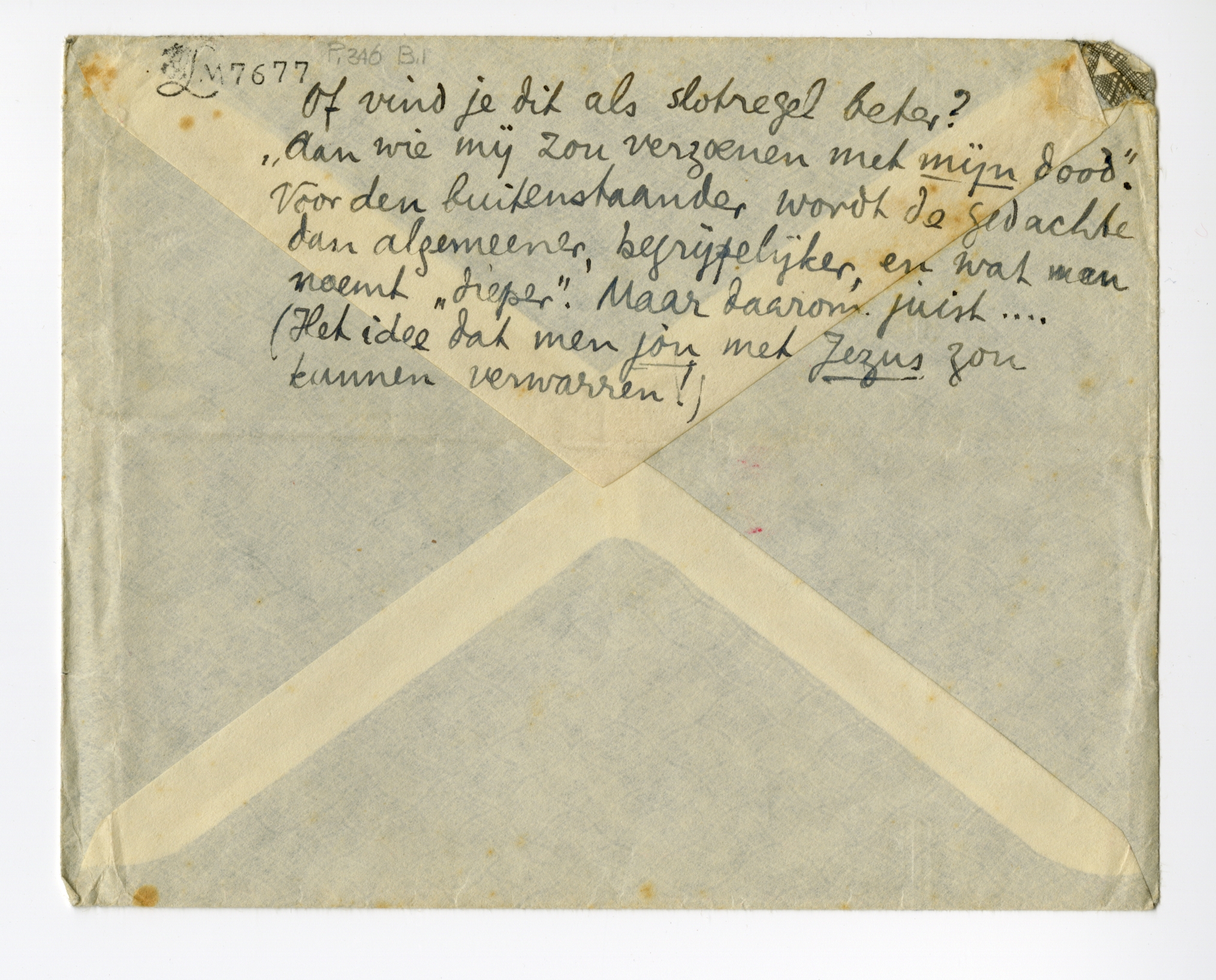 7138Geschreven op de achterzijde van een ongefrankeerde envelop, die geadresseerd was aan ‘Mejuffrouw Elisabeth de Roos (2e missive)’; de eerste is niet teruggevonden. DP koos met wijziging van ‘zou’ in ‘kon’ voor deze slotregel.