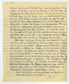 Daarnet krijg ik een briefje van Maurice, dat hij het vers van Engelman, als strijdig met onze ‘grondwet’, afwees.7139 Ik begrijp er blijkbaar niets meer van. Ik dacht dat een goed vers, van een persoonlijk auteur, goed voor Forum was. Maar de anti-poésie-pure wordt ònze hobby en binnenkort ònze leeraars-katheder. - Het eenige wat we ermee winnen is dat we geen copy, of althans geen verzen meer krijgen van Engelman, van wien toch veel goeds te verwachten viel. - En vanwaar jouw plotselinge antipathie* tegen Greshoff? Waarom in Godsnaam niet in elk nummer een stuk van hem, als die stukken goed zijn? Over deze Bende v/d Stronk moèten we iets zeggen; mijn persoonlijke positie tegenover dit en dergelijk werk heeft zich gewijzigd, en gegeven mijn ruzie met Burssens juist hierover, wil ik er geen enkele deprecieerende meening over zeggen - gegeven ook mijn vriendschap voor P.v.O. † -; daarnaast ben ik zeker dat Greshoff er een héél behoorlijk stuk over schrijven zal; hij wil het bovendien combineeren met een bespr. van een ander boekje, dat er qua ‘Europeesche geest’ geheel bij komt en ook Vlaamsch is, De Exploten van Tabarijn van Vriamont. Dat maakt m.i. een voortreffelijk Forum-stukje, en waarom dan ‘liever niet’ van Greshoff?7140 Als je de ‘buitenwereld’ bekijkt, dan zie je die gesplitst in twee groepen: de begrijpers (genre Van Leeuwen) en de vijandigen. De laatsten vinden mij, Menno, iedereen die zich op ‘onze manier’ uitdrukt even ‘erg’; de eersten ruimen, zooals je hebt kunnen zien, een goed plaatsje in voor Greshoff. Als wij Greshoff nu ook al zoo'n beetje afwijzend en uit de hoogte gaan behandelen, worden we idioot, d.w.z. aangestoken door een min-of-meer aesthetische literatoren-idiotie, waar we in Panopticum juist zoo tegen strijden. - En ook de liedjes van Greshoff, al schrijft hij dan misschien binnen zijn eigen productie wat te veel (dit is een ‘voorbehoud’ apart), blijven daarom toch niet minder, in het genre, van de beste!