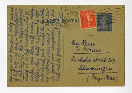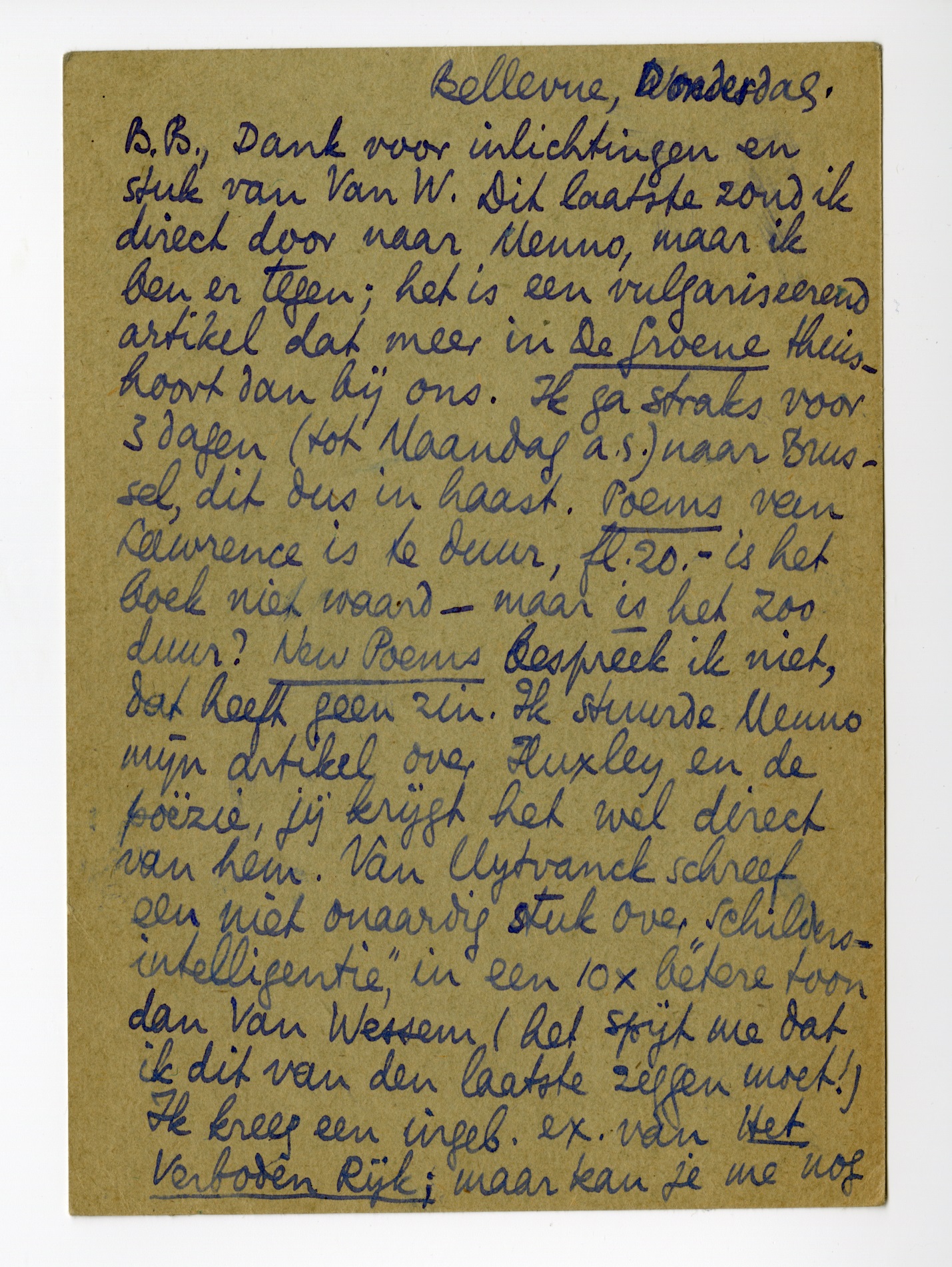 B.B., Dank voor inlichtingen en stuk van Van W.7237 Dit laatste zond ik direct door naar Menno, maar ik ben er tegen; het is een vulgariseerend artikel dat meer in De Groene thuishoort dan bij ons. Ik ga straks voor 3 dagen (tot Maandag a.s.) naar Brussel, dit dus in haast. Poems van Lawrence is te duur, fl. 20. - is het boek niet waard - maar is het zoo duur? New Poems7238 bespreek ik niet, dat heeft geen zin. Ik stuurde Menno mijn artikel over Huxley en de poëzie7239, jij krijgt het wel direct van hem. Van Uytvanck schreef een niet onaardig stuk7240 over ‘schilders-intelligentie’, in een 10 × betere toon dan Van Wessem (het spijt me dat ik dit van den laatste zeggen moet!) Ik kreeg een ingeb. ex. van Het Verboden Rijk, maar kan je me nog een ingenaaid bezorgen? Wschl. bespreek ik het nog wel eens7241 - misschien voor Gr. Nederland(?) Het is zeker lang niet slecht, al is het misschien niet geworden wat Slau zelf ervan maken wilde; Slau heeft een toon die toch verdomd veel goed maakt en tenslotte nog wel wat meer waard is dan zuiver gevoel voor compositie. Nu, het beste met de gastronomie!7242