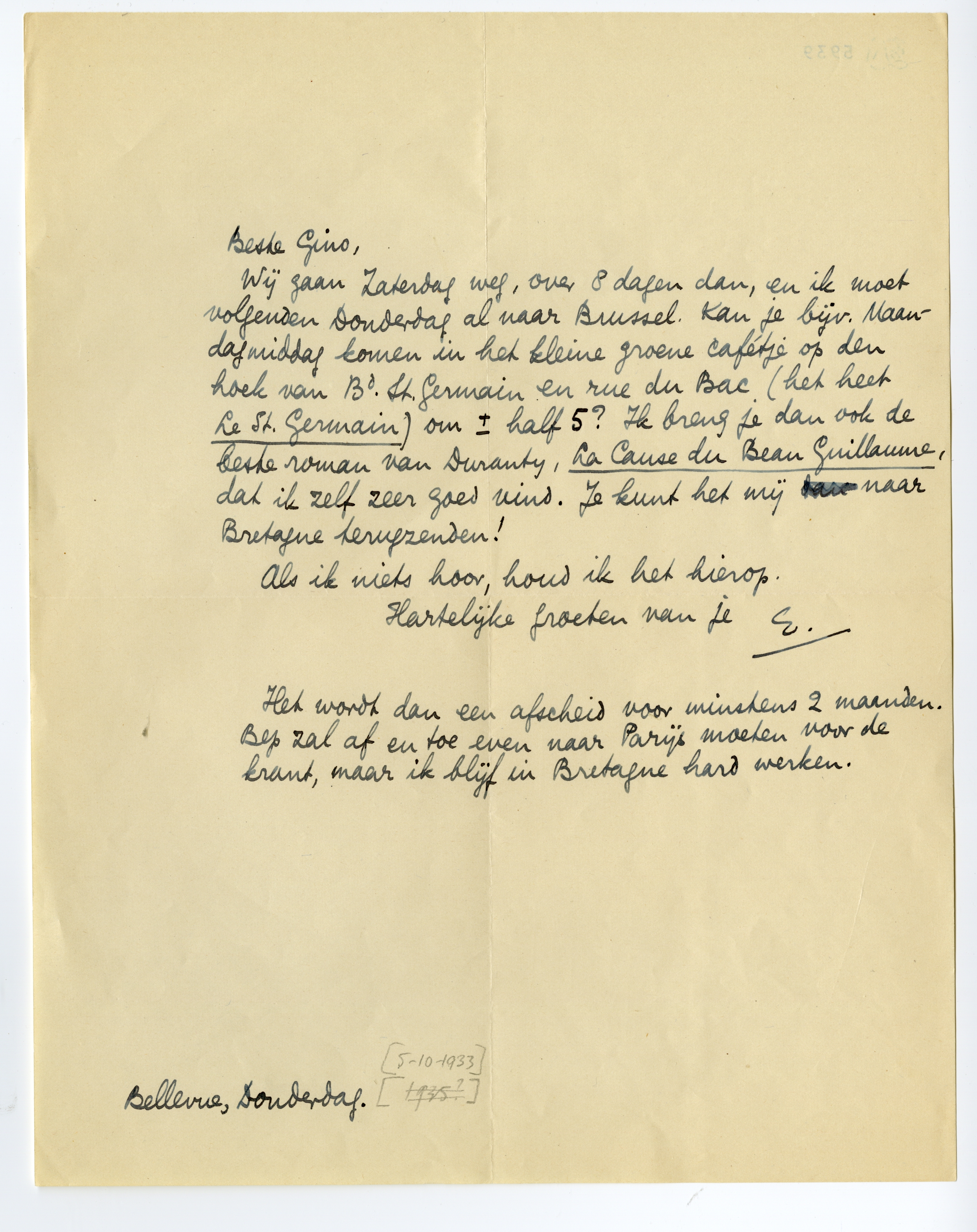 Wij gaan Zaterdag weg, over 8 dagen dan, en ik moet volgenden Donderdag al naar Brussel. Kan je bijv. Maandagmiddag komen in het kleine groene cafétje op den hoek van Bd. St. Germain en rue du Bac (het heet Le St. Germain) om ± half 5? Ik breng je dan ook de beste roman van Duranty, La Cause du Beau Guillaume, dat ik zelf zeer goed vind. Je kunt het mij dan naar Bretagne terugzenden!