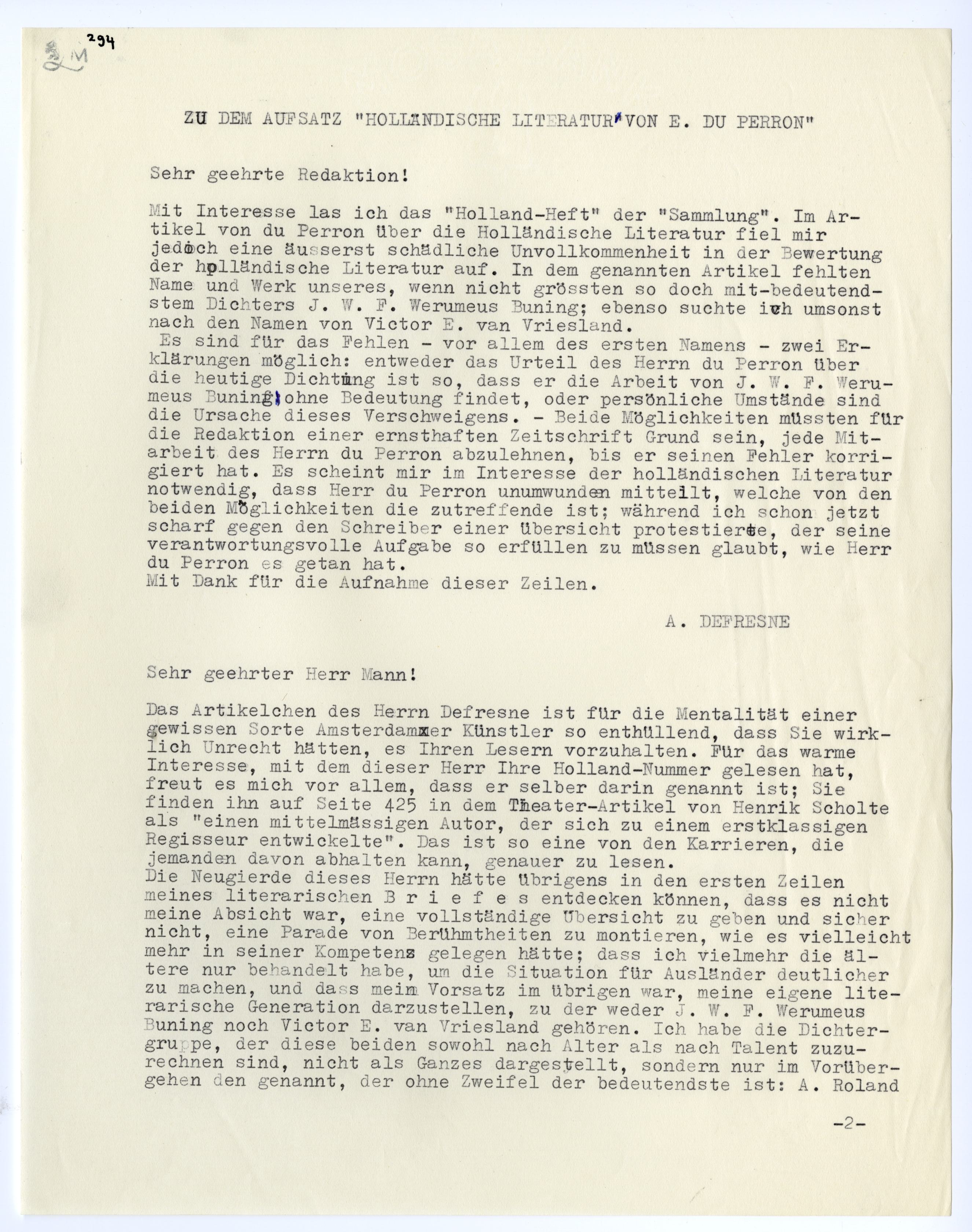 Was die Bedeutung betrifft, die ich dem Werke J.W.F. Werumeus Buning's zuerkenne, verweise ich Herrn Defresne auf meinem Artikel über diesen Dichter im ‘Forum’ April 1933.7398 Er möge mit den Angaben, die er in diesem Artikel finden kann, statt meiner ‘den Fehler korrigieren’; womit ich gleichzeitig die ‘unumwundene Mitteilung’ mache, dass ich ihn, Herrn Defresne, sei es als Autor oder Regisseur - genau wie er das selber am liebsten hat, - an ‘Redaktionen ernsthafter Zeitschriften’ stets mit Liebe empfehle.