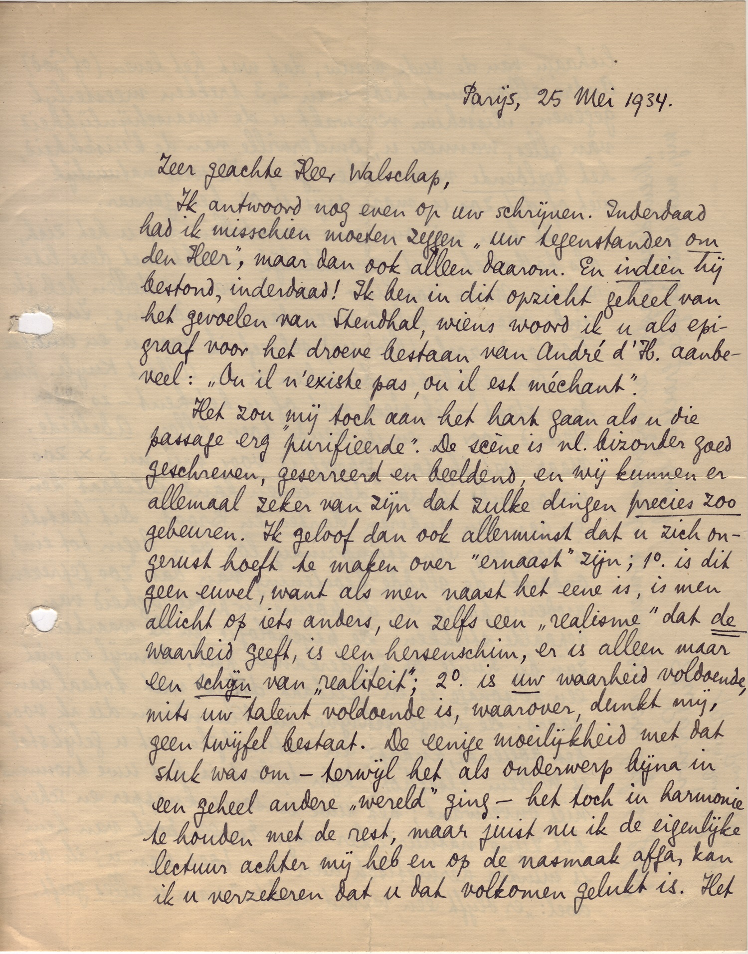 Het zou mij toch aan het hart gaan als u die passage7411 erg ‘purifieerde’. De scène is nl. bizonder goed geschreven, geserreerd en beeldend, en wij kunnen er allemaal zeker van zijn dat zulke dingen precies zoo gebeuren. Ik geloof dan ook allerminst dat u zich ongerust hoeft te maken over ‘ernaast’ zijn; 1o. is dit geen euvel, want als men naast het eene is, is men allicht op iets anders, en zelfs een ‘realisme’ dat de7412 waarheid geeft, is een hersenschim, er is alleen maar een schijn van ‘realiteit’; 2o. is uw waarheid voldoende, mits uw talent voldoende is, waarover, dunkt mij, geen twijfel bestaat. De eenige moeilijkheid met dat stuk was om - terwijl het als onderwerp bijna in een geheel andere ‘wereld’ ging - het toch in harmonie te houden met de rest, maar juist nu ik de eigenlijke lectuur achter mij heb en op de nasmaak afga, kan ik u verzekeren dat u dat volkomen gelukt is. Het lichaam van de oude vrouw, dat wat het leven (of God) André alleen gunt, hebt u in 2, 3 trekken meesterlijk gegeven. Misschien verzwakt u de waarschijnlijkheid van alles, wanneer u, omderwille van de kuischheid, het beeldende verzwakken ging. Ik weet natuurlijk niet of dit zoo is, maar wijs u op het gevaar.