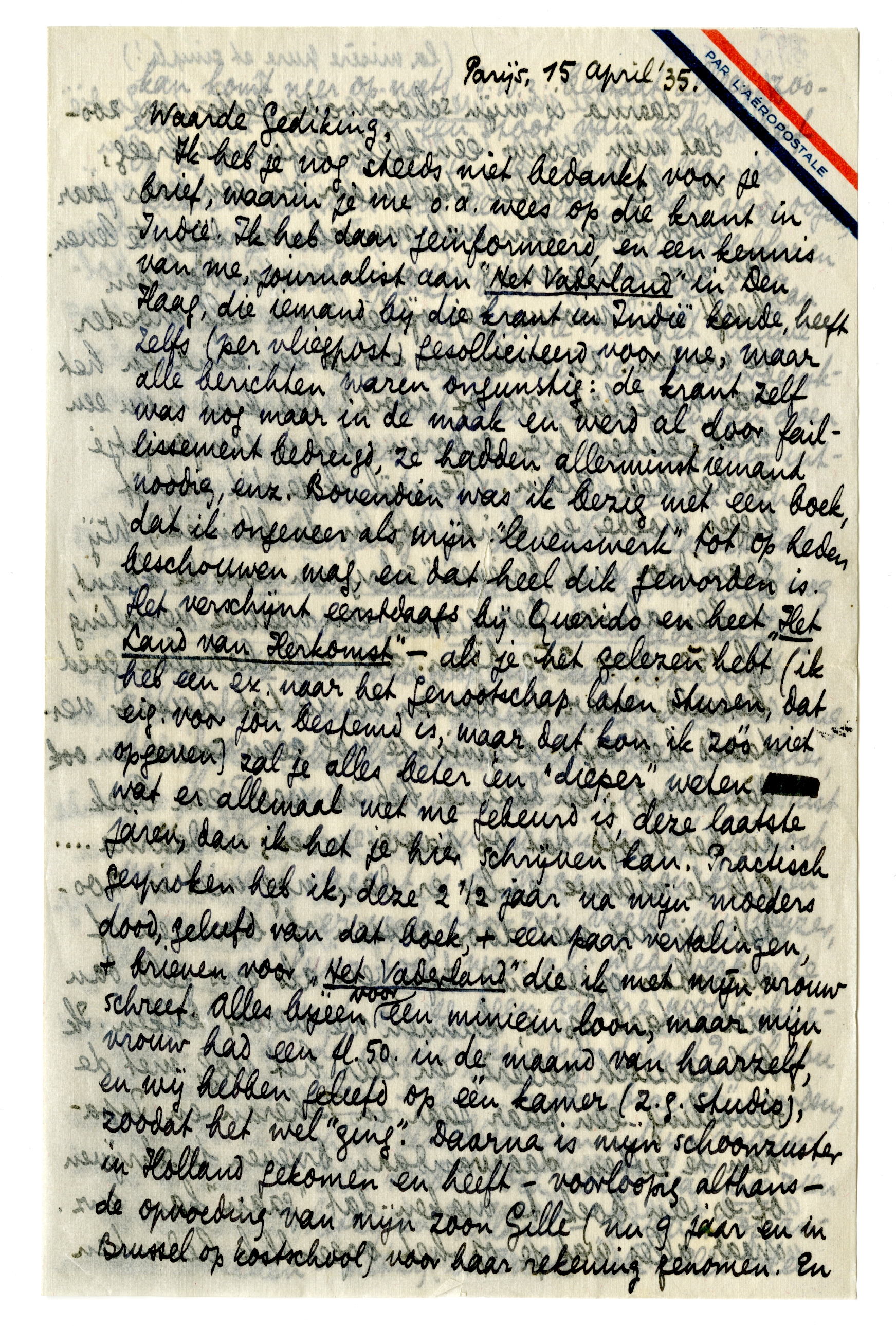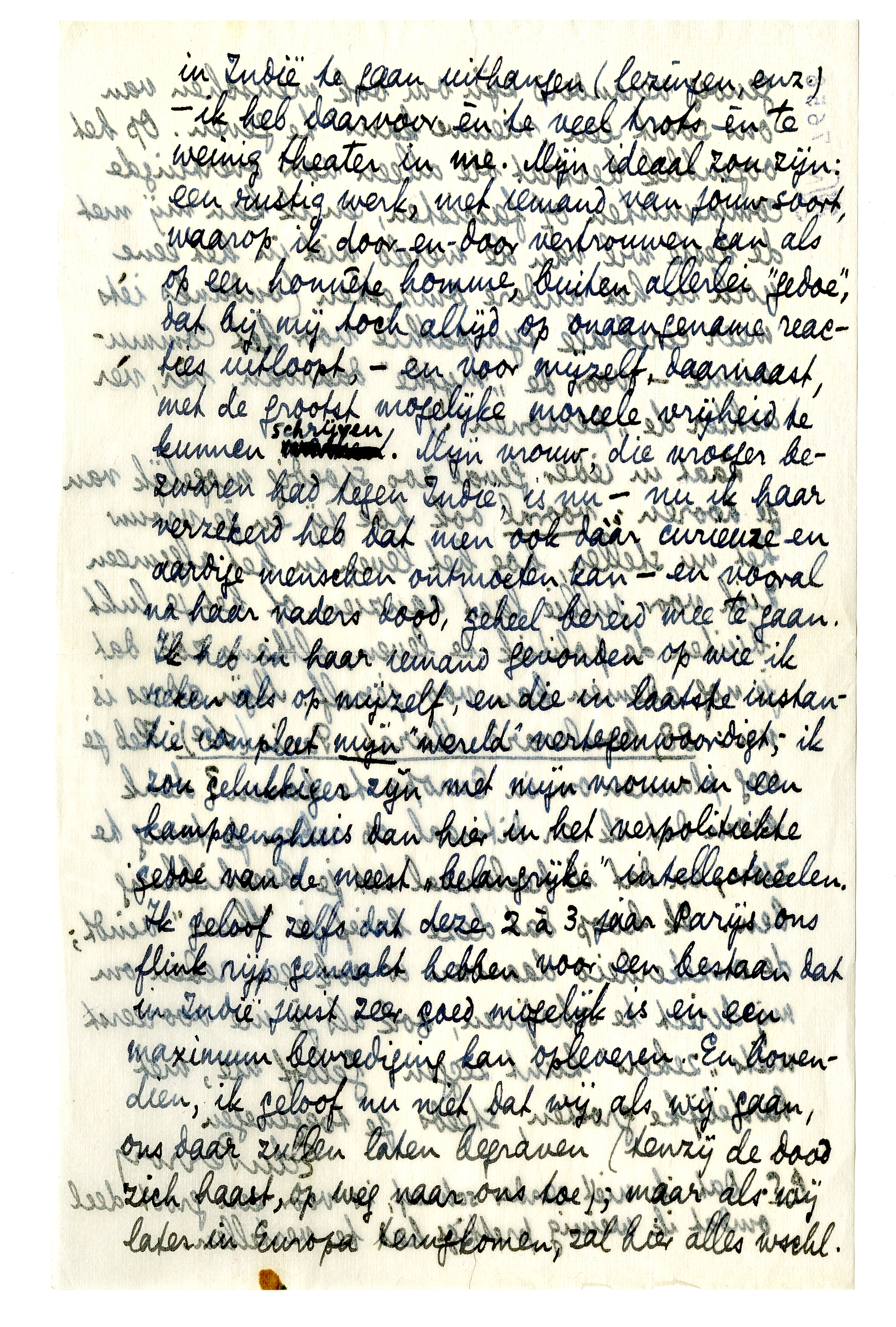 Laat in ieder geval zoo spoedig mogelijk van je hooren: vooral ook hoe jij en je vrouw het nu stellen, hoe het leven in het algemeen zich voor jullie laat aanzien, of het je lukt buiten de politiek te leven, althans zóó dat je nog ademen kan voor jezelf. Mijn adres is nu: 88, boulevard Murat, Paris (16e). Heb je nog plannen om in Europa te komen? denk erom dat ik er ditmaal op reken je terug te zien, en dat ik heelemaal tot je beschikking ben. Ik hoop dat deze briefje ‘thuis’ vindt; de onzekerheid daarvan is ook een reden om mij direct te schrijven, ook als je me vooreerst niets ‘zekers’ kunt zeggen. Geloof me, met hartelijke groeten, steeds je toegenegen