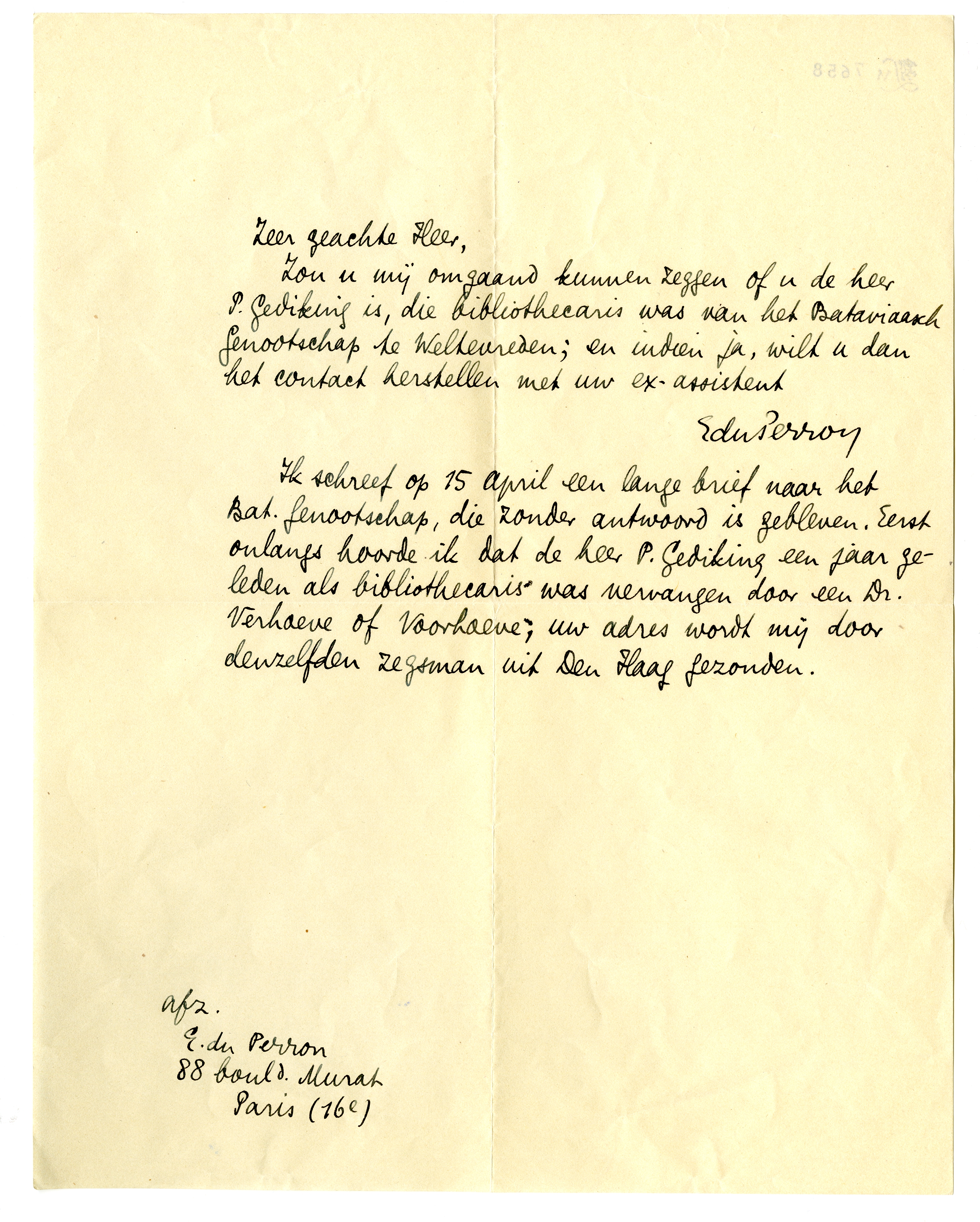 Zou u mij omgaand kunnen zeggen of u de heer P. Gediking is, die bibliothecaris was van het Bataviaasch Genootschap te Weltevreden; en indien ja, wilt u dan het contact herstellen met uw exassistent