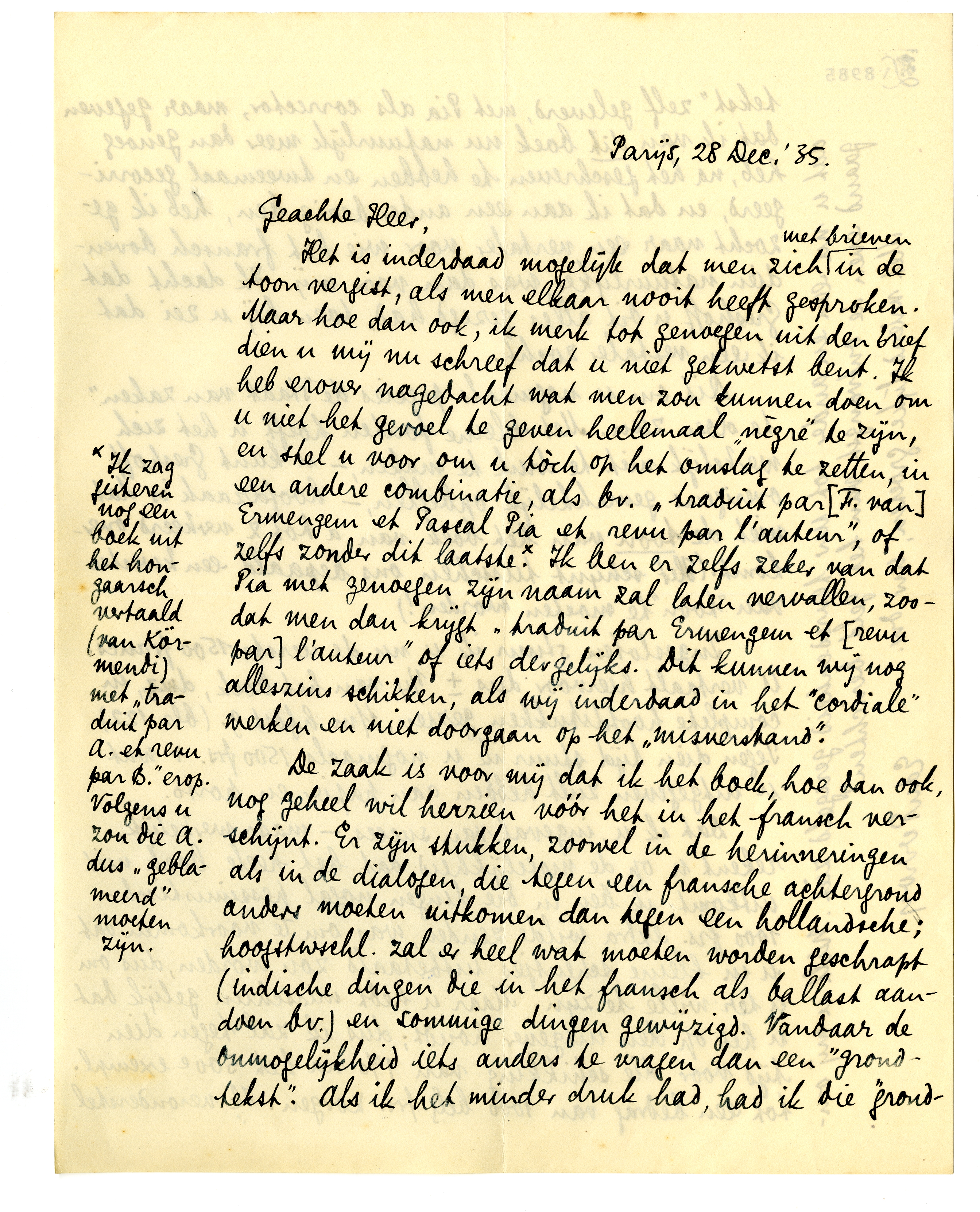 De zaak is voor mij dat ik het boek, hoe dan ook, nog geheel wil herzien vóór het in het fransch verschijnt. Er zijn stukken, zoowel in de herinneringen als in de dialogen, die tegen een fransche achtergrond anders moeten uitkomen dan tegen een hollandsche; hoogstwschl. zal er heel wat moeten worden geschrapt (indische dingen die in het fransch als ballast aandoen bv.) en sommige dingen gewijzigd. Vandaar de onmogelijkheid iets anders te vragen dan een ‘grondtekst’. Als ik het minder druk had, had ik die ‘grondtekst’ zelf geleverd, met Pia als corrector, maar gegeven dat ik van dit boek nu natuurlijk meer dan genoeg heb, na het geschreven te hebben en tweemaal gecorrigeerd, en dat ik aan een ander bezig ben, heb ik gezocht naar een vertaler voor wie het fransch bovendien natuurlijker was dan voor mij. Ik dacht dat Greshoff u dit alles gezegd had, toen hij u zei dat ik een vertaler zocht.