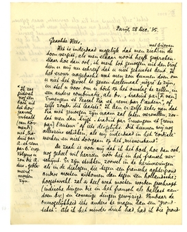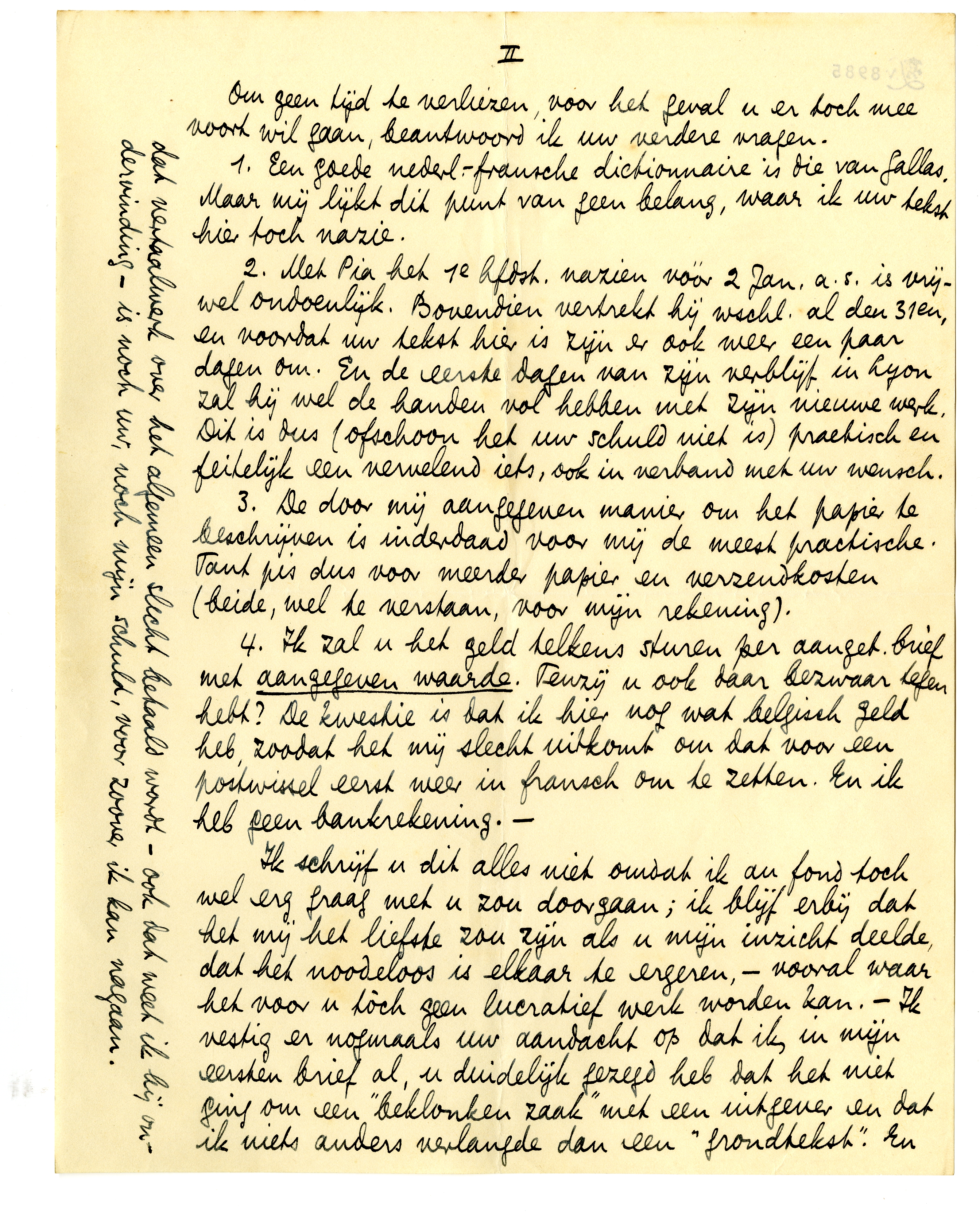 2. Met Pia het 1e hfdst. nazien vóór 2 Jan. a.s. is vrijwel ondoenlijk. Bovendien vertrekt hij wschl. al den 31en, en voordat uw tekst hier is zijn er ook weer een paar dagen om. En de eerste dagen van zijn verblijf in Lyon zal hij wel de handen vol hebben met zijn nieuwe werk. Dit is dus (ofschoon het uw schuld niet is) practisch en feitelijk een vervelend iets, ook in verband met uw wensch.