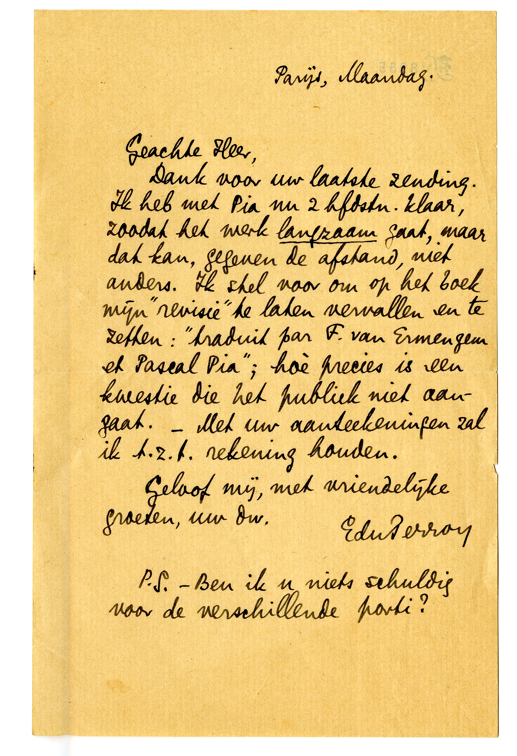 Dank voor uw laatste zending. Ik heb met Pia nu 2 hfdstn. klaar, zoodat het werk langzaam gaat, maar dat kan, gegeven de afstand, niet anders. Ik stel voor om op het boek mijn ‘revisie’ te laten vervallen en te zetten: ‘traduit par F. van Ermengem et Pascal Pia’; hoè precies is een kwestie die het publiek niet aangaat. - Met uw aanteekeningen zal ik t.z.t. rekening houden.