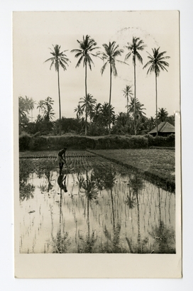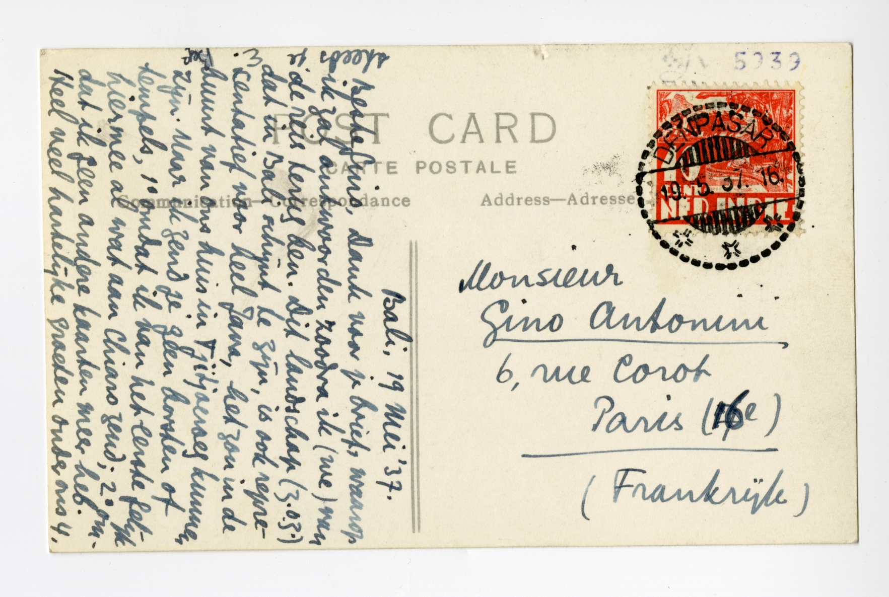 Beste Gino, Dank voor je brief, waarop ik zal antwoorden zoodra ik (we) van de reis terug ben. Dit landschap (z.o.z.) dat in Bali schijnt te zijn, is ook representatief voor heel Java, het zou in de buurt van ons huis in Tjitjoeroeg kunnen zijn. Maar ik zend je geen borsten of tempels, 1o omdat ik van het eerste gelijk hiermee al wat aan Chiaro zendt7649; 2o omdat ik geen andere kaarten meer heb.