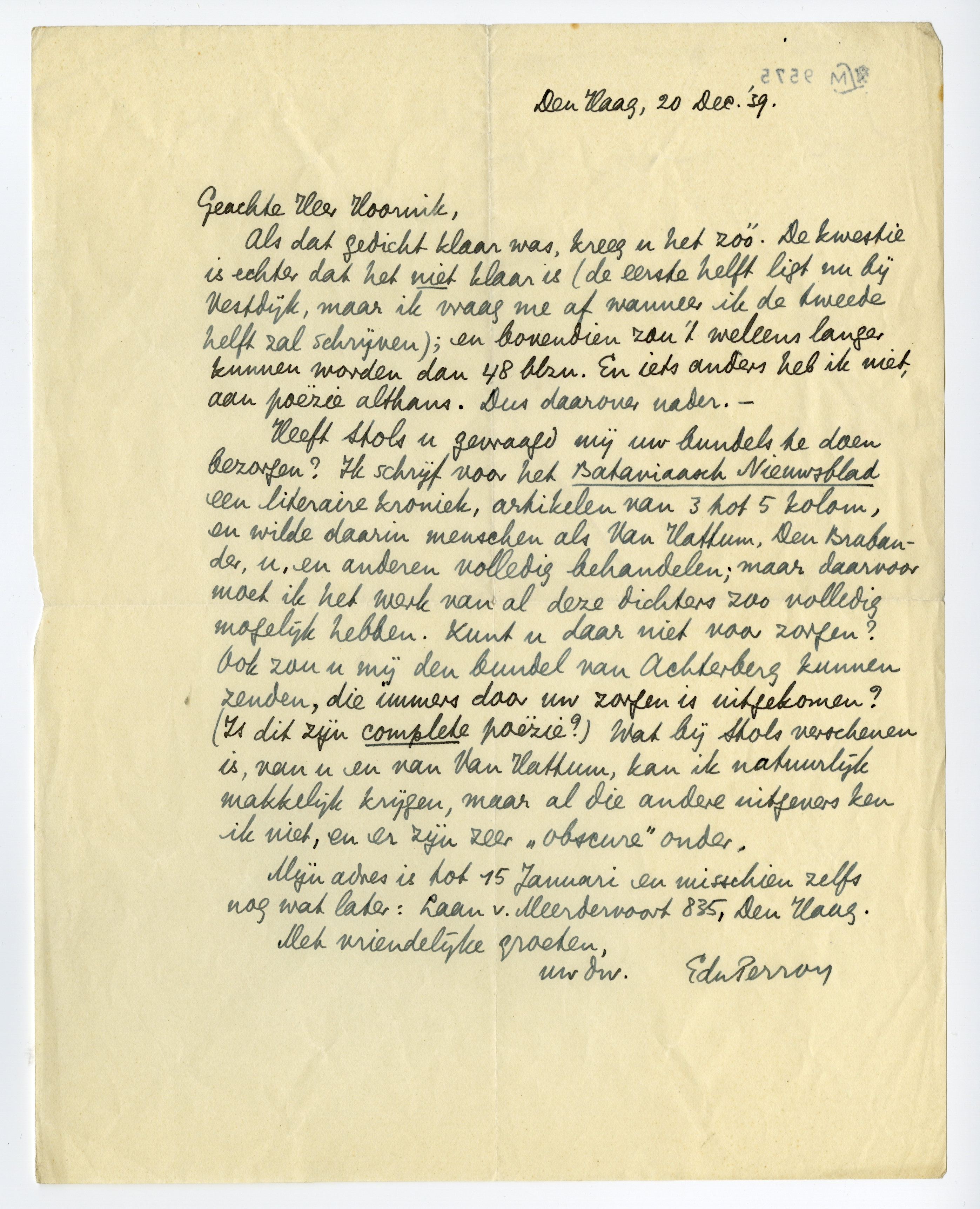 Heeft Stols u gevraagd mij uw bundels7726 te doen bezorgen? Ik schrijf voor het Bataviaasch Nieuwsblad een literaire kroniek, artikelen van 3 tot 5 kolom, en wilde daarin menschen als Van Hattum, Den Brabander, u, en anderen volledig behandelen7727; maar daarvoor moet ik het werk van al deze dichters zoo volledig mogelijk hebben. Kunt u daar niet voor zorgen? Ook zou u mij den bundel van Achterberg kunnen zenden, die immers door uw zorgen is uitgekomen? (Is dit zijn complete poëzie?)7728 Wat bij Stols verschenen is, van u en van Van Hattum,7729 kan ik natuurlijk makkelijk krijgen, maar al die andere uitgevers ken ik niet, en er zijn zeer ‘obscure’ onder.