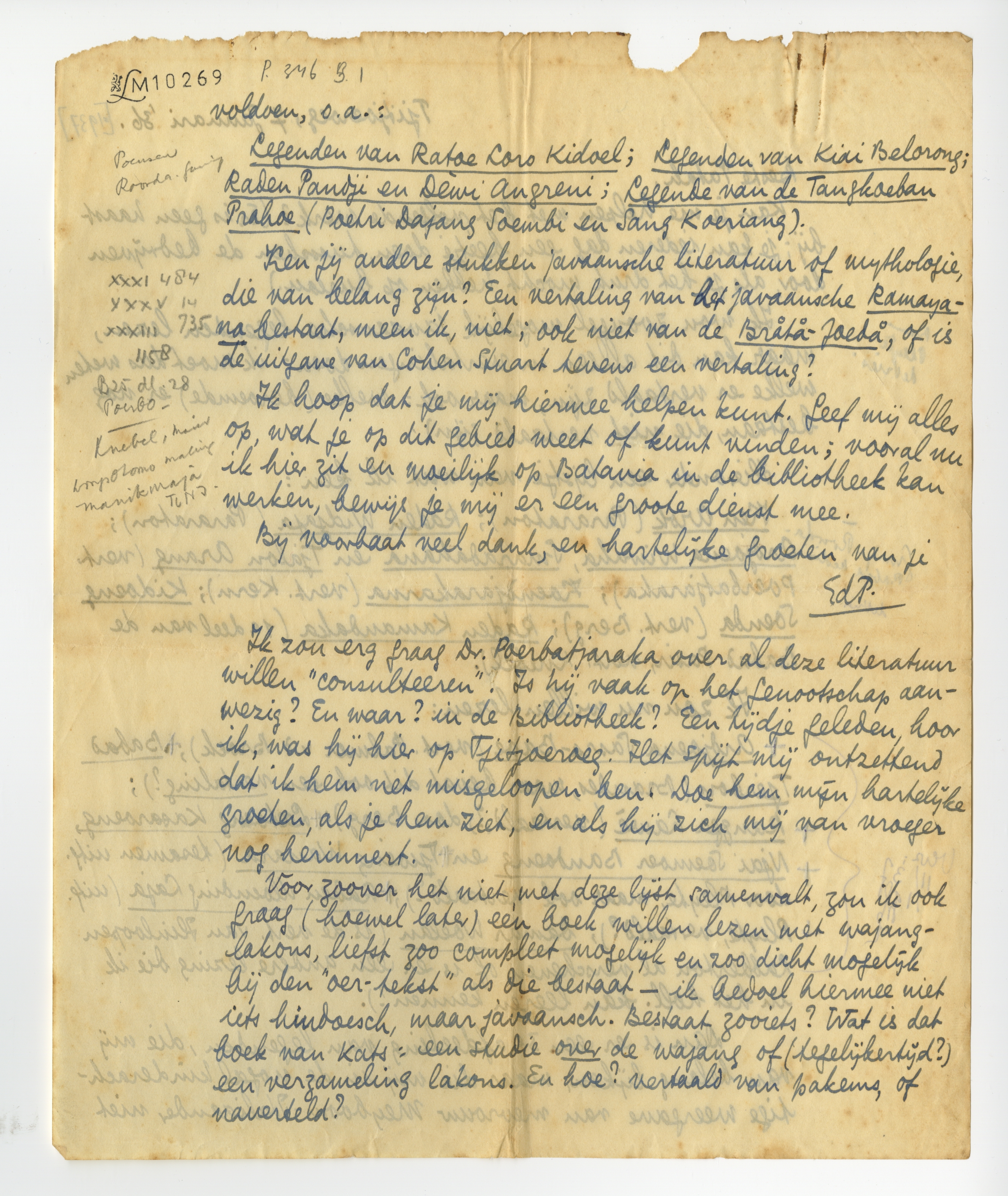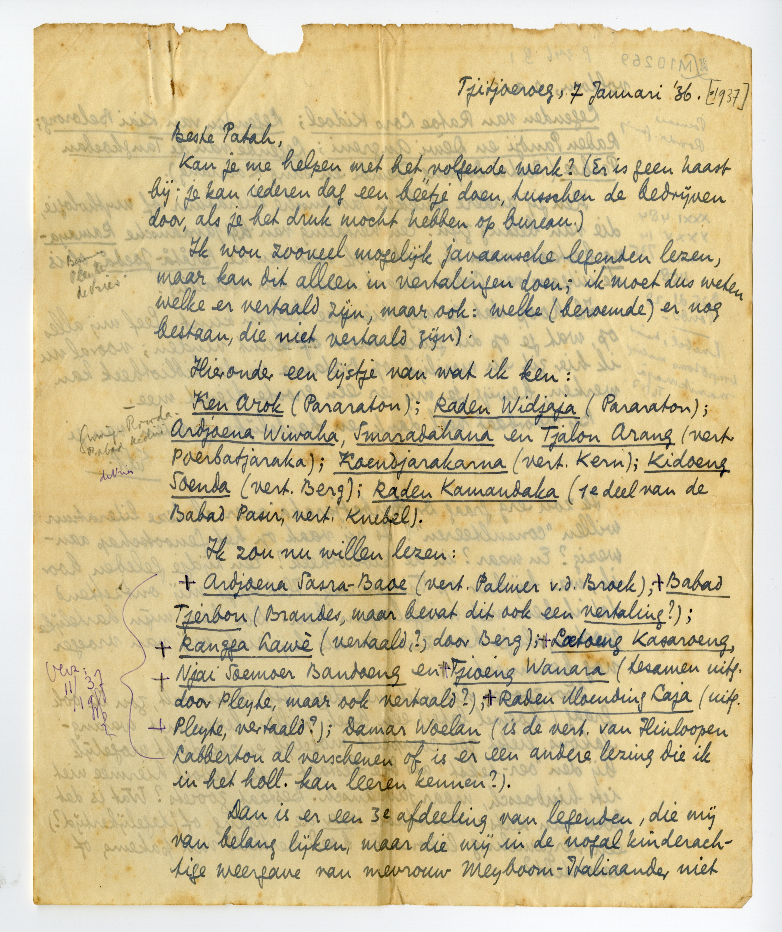 Ik zou erg graag Dr. Poerbatjaraka over al deze literatuur willen ‘consulteeren’. Is hij vaak op het Genootschap aanwezig? En waar? in de Bibliotheek? Een tijdje geleden, hoor ik, was hij hier op Tjitjoeroeg. Het spijt mij ontzettend dat ik hem net misgeloopen ben. Doe hem mijn hartelijke groeten, als je hem ziet, en als hij zich mij van vroeger nog herinnert.