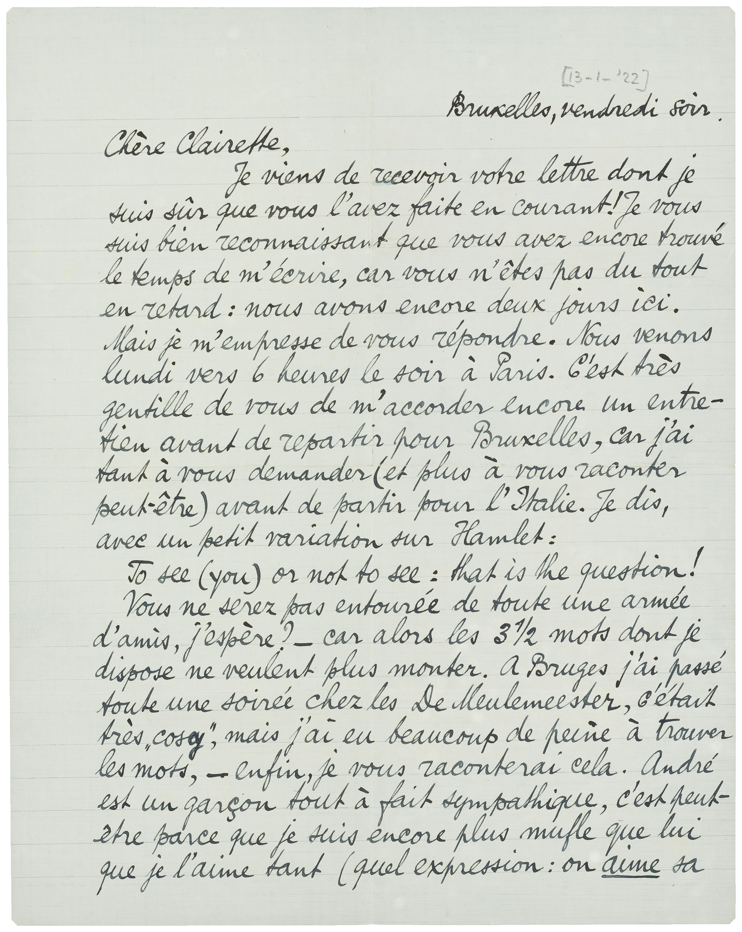 Je viens de recevoir votre lettre dont je suis sûr que vous l'avez faite en courant! Je vous suis bien reconnaissant que vous avez encore trouvé le temps de m'écrire, car vous n'êtes pas du tout en retard: nous avons encore deux jours ici. Mais je m'empresse de vous répondre. Nous venons lundi vers 6 heures le soir à Paris. C'est très gentille de vous de m'accorder encore un entretien avant de repartir pour Bruxelles, car j'ai tant à vous demander (et plus à vous raconter peut-être) avant de partir pour l'Italie. Je dis, avec un petit variation sur Hamlet: