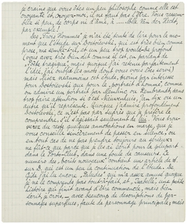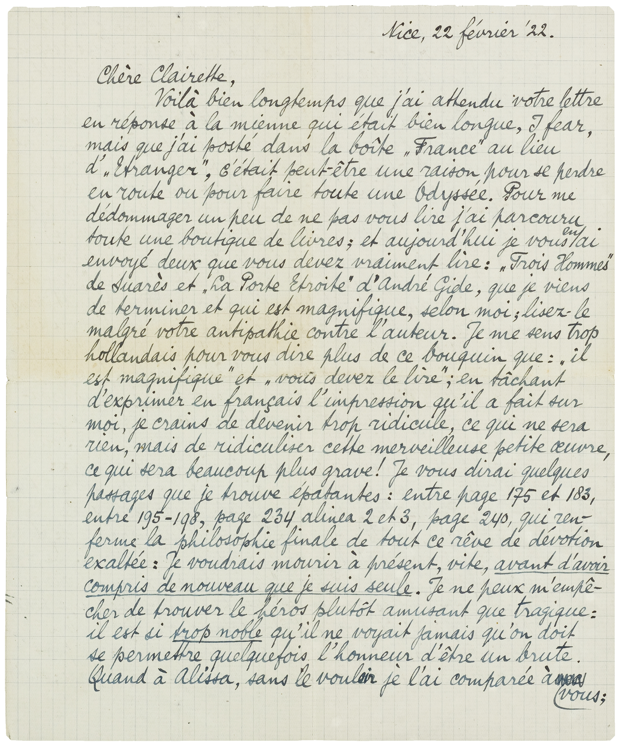 Voilà bien longtemps que j'ai attendu votre lettre en réponse à la mienne qui était bien longue, I fear, mais que j'ai posté dans la boîte ‘France’ au lieu d'‘Etranger’, c'était peut-être une raison pour se perdre en route ou pour faire toute une Odyssée. Pour me dédommager un peu de ne pas vous lire j'ai parcouru toute une boutique de livres; et aujourd'hui je vous en ai envoyé deux que vous devez vraiment lire: Trois Hommes de Suarès et La Porte Etroite d'André Gide, que je viens de terminer et qui est magnifique, selon moi; lisez-le malgré votre antipathie contre l'auteur. Je me sens trop hollandais pour vous dire plus de ce bouquin que: ‘il est magnifique’ et ‘vous devez le lire’; en tâchant d'exprimer en français l'impression qu'il a fait sur moi, je crains de devenir trop ridicule, ce qui ne sera rien, mais de ridiculiser cette merveilleuse petite oevre ce qui sera beaucoup plus grave! Je vous dirai quelques passages que je trouve épatantes: entre page 175 et 183, entre 195-198, page 234 alinea 2 et 3, page 240, qui renferme la philosophie finale de tout ce rêve de dévotion exaltée: Je voudrais mourir à présent, vite, avant d'avoir compris de nouveau que je suis seule. Je ne peux m'empêcher de trouver le héros plutôt amusant que tragique: il est si trop noble qu'il ne voyait jamais qu'on doit se permettre quelquefois l'honneur d'être un brute. Quand à Alissa, sans le vouloir je l'ai comparée à vous; je crains que vous êtes un peu philosophe comme elle est croyante et, croyez-moi, il ne faut pas l'être. Vous ressemblez si peu, de corps ni d'âme, à.... Mlle. Van der Hecht, par exemple!