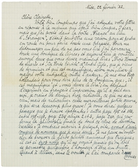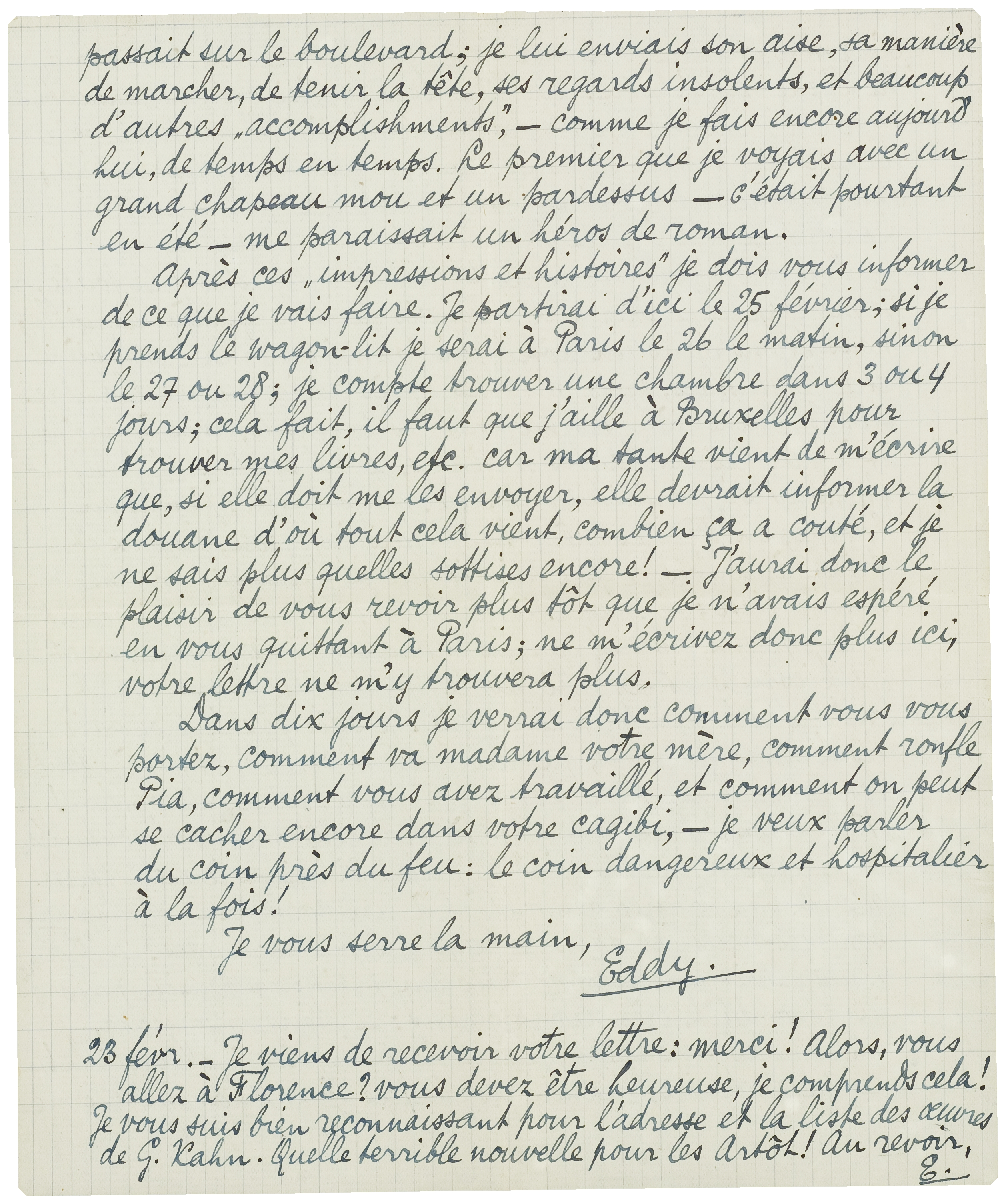 23 févr. - Je viens de recevoir votre lettre: merci! Alors, vous allez à Florence? Vous devez être heureuse, je comprends cela! Je vous suis bien reconnaissant pour l'adresse et la liste des oeuvres de G. Kahn. Quelle terrible nouvelle pour les Artôt! Au revoir,
