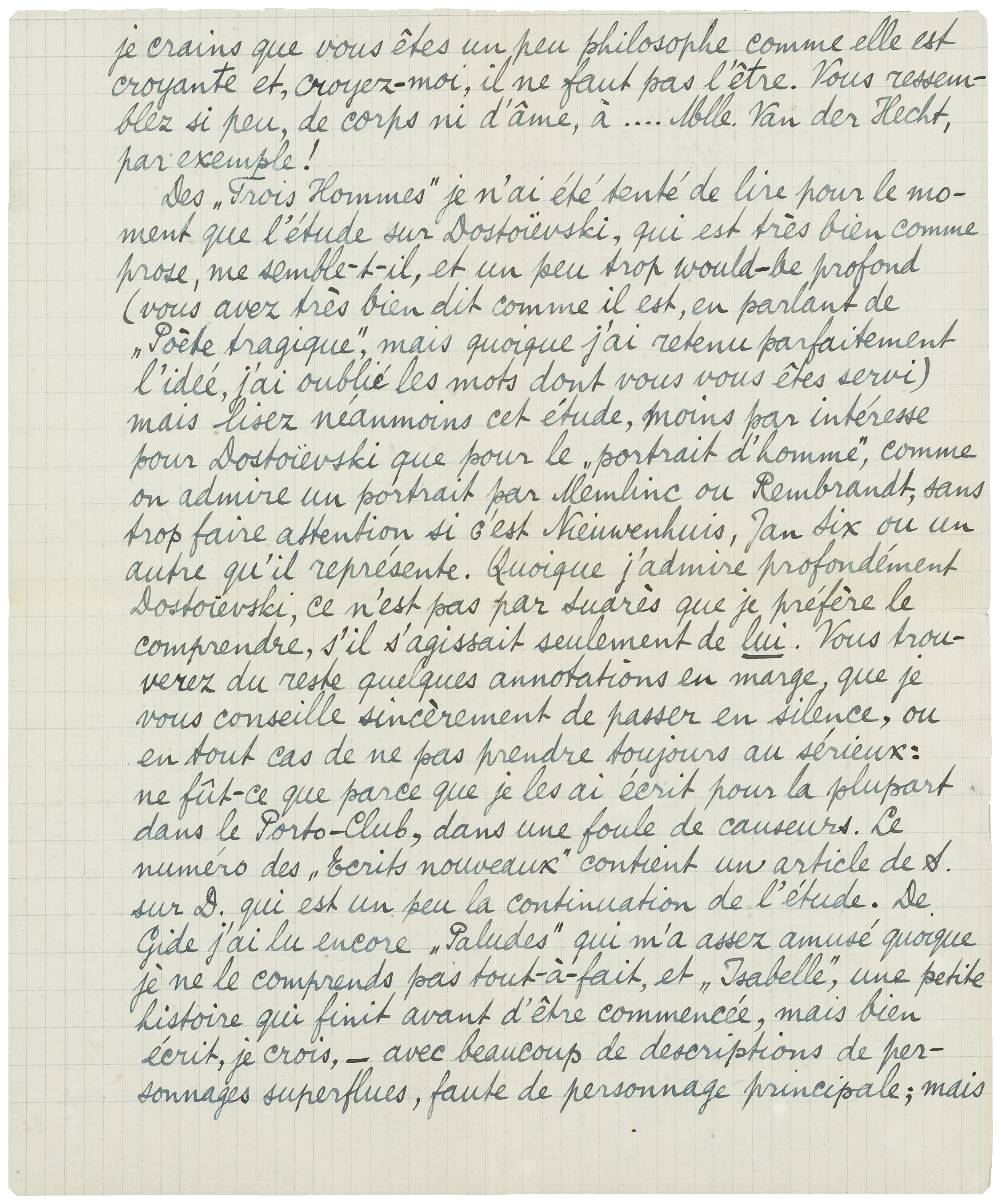 Des ‘Trois Hommes’ je n'ai été tenté de lire pour le moment que l'étude sur Dostoïevski, qui est très bien comme prose, me semble-t-il, et un peu trop would-be profond (vous avez très bien dit comme il est, en parlant de ‘Poète tragique’, mais quoique j'ai retenu parfaitement l'idée, j'ai oublié les mots dont vous vous êtes servi) mais lisez néanmoins cet étude, moins par intéresse pour Dostoïevski que pour le ‘portrait d'homme’, comme on admire un portrait par Memlinc ou Rembrandt, sans trop faire attention si c'est Nieuwenhuis, Jan Six ou un autre qu'il représente. Quoique j'admire profondément Dostoïevski, ce n'est pas par Suarès que je préfère le comprendre, s'il s'agissait seulement de lui. Vous trouverez du reste quelques annotations en marge, que je vous conseille sincèrement de passer en silence, ou en tout cas de ne pas prendre toujours au sérieux: ne fût-ce que parce que je les ai écrit pour la plupart dans le Porto-Club, dans une foule de causeurs. Le numéro des Ecrits nouveaux contient un article de S. sur D. qui est un peu la continuation de l'étude. De Gide j'ai lu encore Paludes qui m'a assez amusé quoique je ne le comprends pas tout-à-fait, et Isabelle, une petite histoire qui finit avant d'être commencée, mais bien écrit, je crois,- avec beaucoup de descriptions de personnages superflues, faute de personnage principale; mais on est étonné d'être tout-de-même suffisamment intéressé par un tel procédé, et cela prouve le talent de l'auteur, et ma bonne volonté. - Puis un tas d'autres choses dont je ne vous enverrai sûrement pas la ‘catalogue raisonnée’!