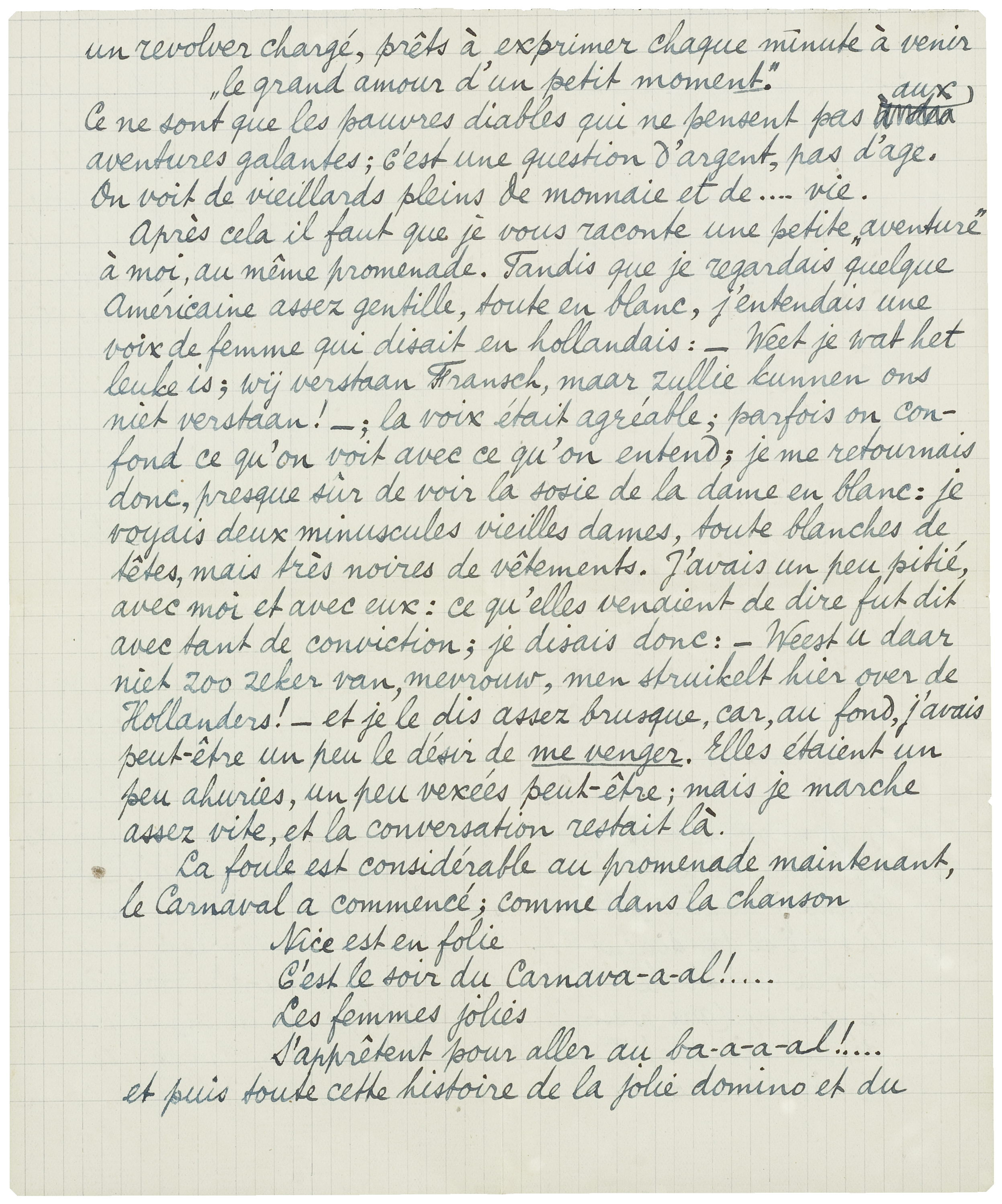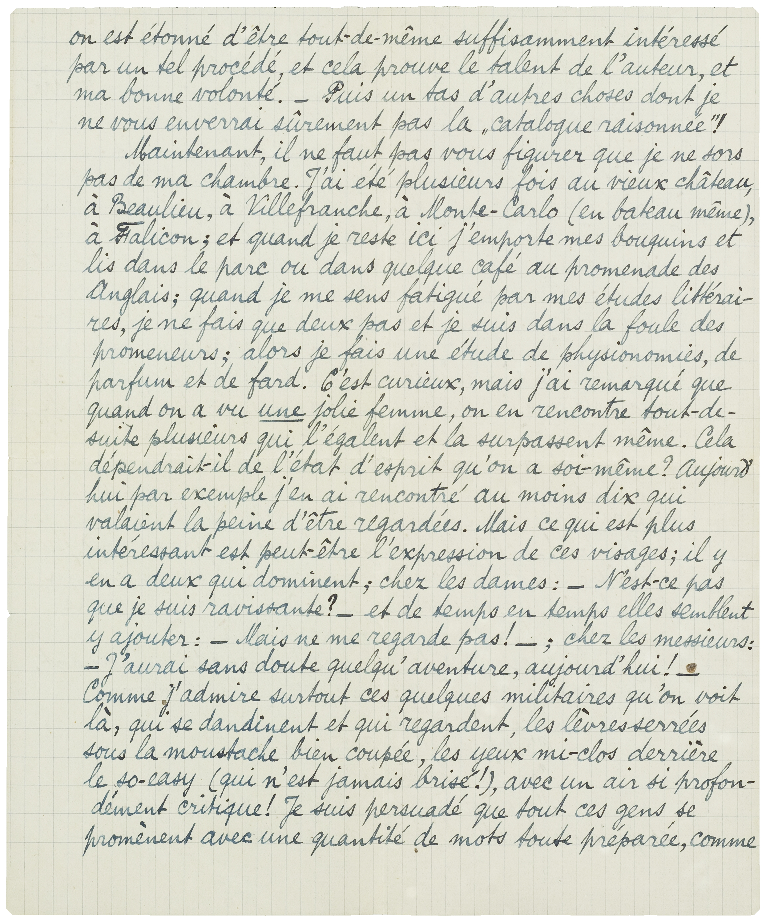 Maintenant, il ne faut pas vous figurer que je ne sors pas de ma chambre. J'ai été plusieurs fois au vieux château, à Beaulieu, à Villefranche, à Monte-Carlo (en bâteau même), à Falicon; et quand je reste ici j'emporte mes bouquins et lis dans le parc ou dans quelque café au promenade des Anglais; quand je me sens fatigué par mes études littéraires, je ne fais que deux pas et je suis dans la foule des promeneurs; alors je fais une étude de physionomies, de parfum et de fard. C'est curieux, mais j'ai remarqué que quand on a vu une jolie femme, on en rencontre tout-de-suite plusieurs qui l'égalent et la surpassent même. Cela dépendrait-il de l'état d'esprit qu'on a soi-même? Aujourd'hui par exemple j'en ai rencontré au moins dix qui valaient la peine d'être regardées. Mais ce qui est plus intéressant est peut-être l'expression de ces visages; il y en a deux qui dominent; chez les dames: - N'est-ce pas que je suis ravissante? - et de temps en temps elles semblent y ajouter: - Mais ne me regarde pas! -; chez les messieurs: - J'aurai sans doute quelqu'aventure, aujourd'hui! - Comme j'admire surtout ces quelques militaires qu'on voit là, qui se dandinent et qui regardent, les lèvres serrées sous la moustache bien coupée, les yeux mi-clos derrière le so-easy (qui n'est jamais brisé!), avec un air si profondément critique! Je suis persuadé que tout ces gens se promènent avec une quantité de mots toute préparée, comme un revolver chargé, prêts à exprimer chaque minute à venir