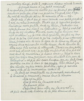 et puis toute cette histoire de la jolie domino et du pierrot fantasque, qui m'a fait regretter de ne connaître ni l'une ni l'autre. Au lieu de cela j'ai été en contact avec un monsieur en pardessus, tout simplement, qui m'a flanqué du trottoir dans la rue avec un bon coup de pied; c'est devenu une histoire assez embêtante qui m'a gâté beaucoup de ma joie de Carnaval!