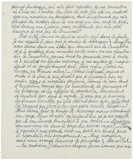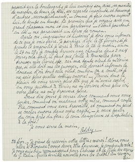 Après ces ‘impressions et histoires’ je dois vous informer de ce que je vais faire. Je partirai d'ici le 25 février; si je prends le wagon-lit je serai à Paris le 26 le matin, sinon le 27 ou 28; je compte trouver une chambre dans 3 ou 4 jours; cela fait, il faut que j'aille à Bruxelles pour trouver mes livres, etc. car ma tante vient de m'écrire que, si elle doit me les envoyer, elle devrait informer la douane d'où tout cela vient, combien ça a couté, et je ne sais plus quelles sottises encore! - J'aurai donc le plaisir de vous revoir plus tôt que je n'avais espéré en vous quittant à Paris; ne m'écrivez donc plus ici, votre lettre ne m'y trouvera plus.