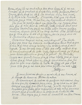 Avez-vous reçu ma seconde lettre poste restante, maintenant? Après avoir lu ce que vous venez de m'écrire je ne peux faire autrement que vous demander encore une fois pardon. Vous êtes assez bonne que belle, Clairette, et je crois (car d'où aurai-je l'expérience, moi?) que ce sont deux choses qu'on trouve très peu ensemble. Il ne vous manque qu'une chose: être moins philosophe. Je voudrais que la Sorbonne était brulée avec tout ses professeurs de philosophie là-dedans, avant que vous y arriviez. Soyez peintre maintenant, artiste, pour étouffer un peu la philosophe!