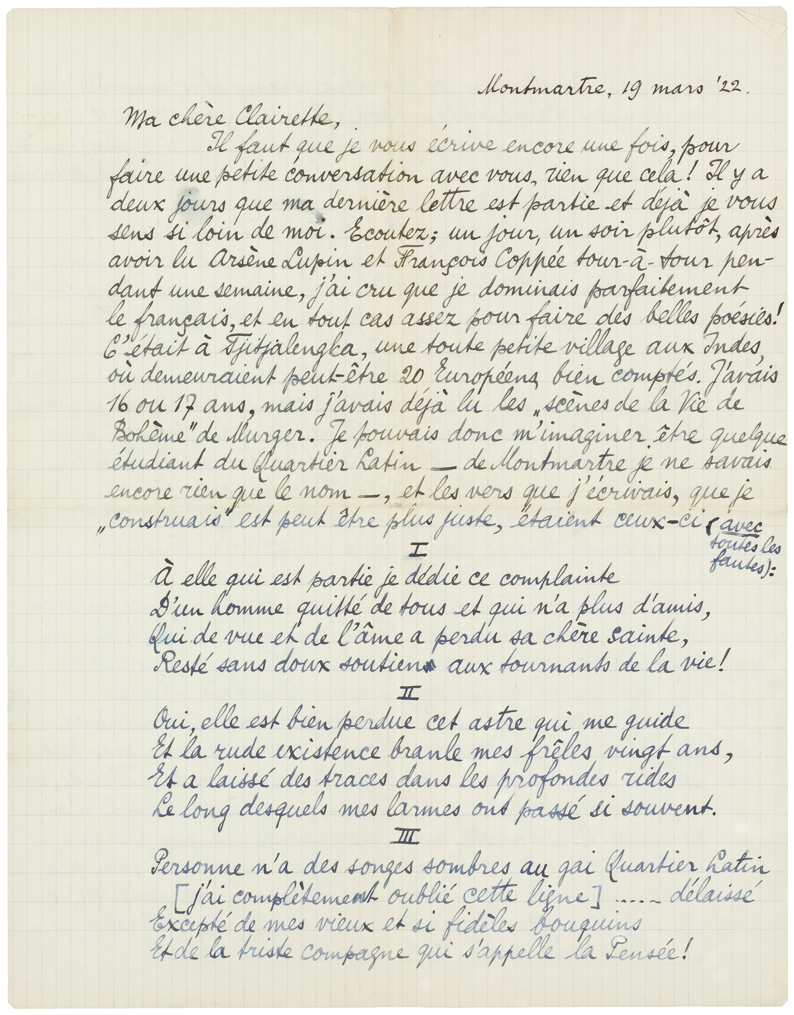 Il faut que je vous écrive encore un fois, pour faire une petite conversation avec vous, rien que cela! Il y a deux jours que ma dernière lettre est partie et déjà je vous sens si loin de moi. Ecoutez; un jour, un soir plutôt, après avoir lu Arsène Lupin et François Coppée tour-à-tour pendant une semaine, j'ai cru que je dominais parfaitement le français, et en tout cas assez pour faire des belles poésies! C'était à Tjitjalengka, une toute petite village aux Indes, où demeuraient peut-être 20 Européens, bien comptés. J'avais 16 ou 17 ans, mais j'avais déjà lu les Scènes de la Vie de Bohème de Murger. Je pouvais donc m'imaginer être quelque étudiant du Quartier Latin - de Montmartre je ne savais encore rien que le nom -, et les vers que j'écrivais, que je ‘construais’ est peut être plus juste, étaient ceux-ci (avec toutes les fautes):