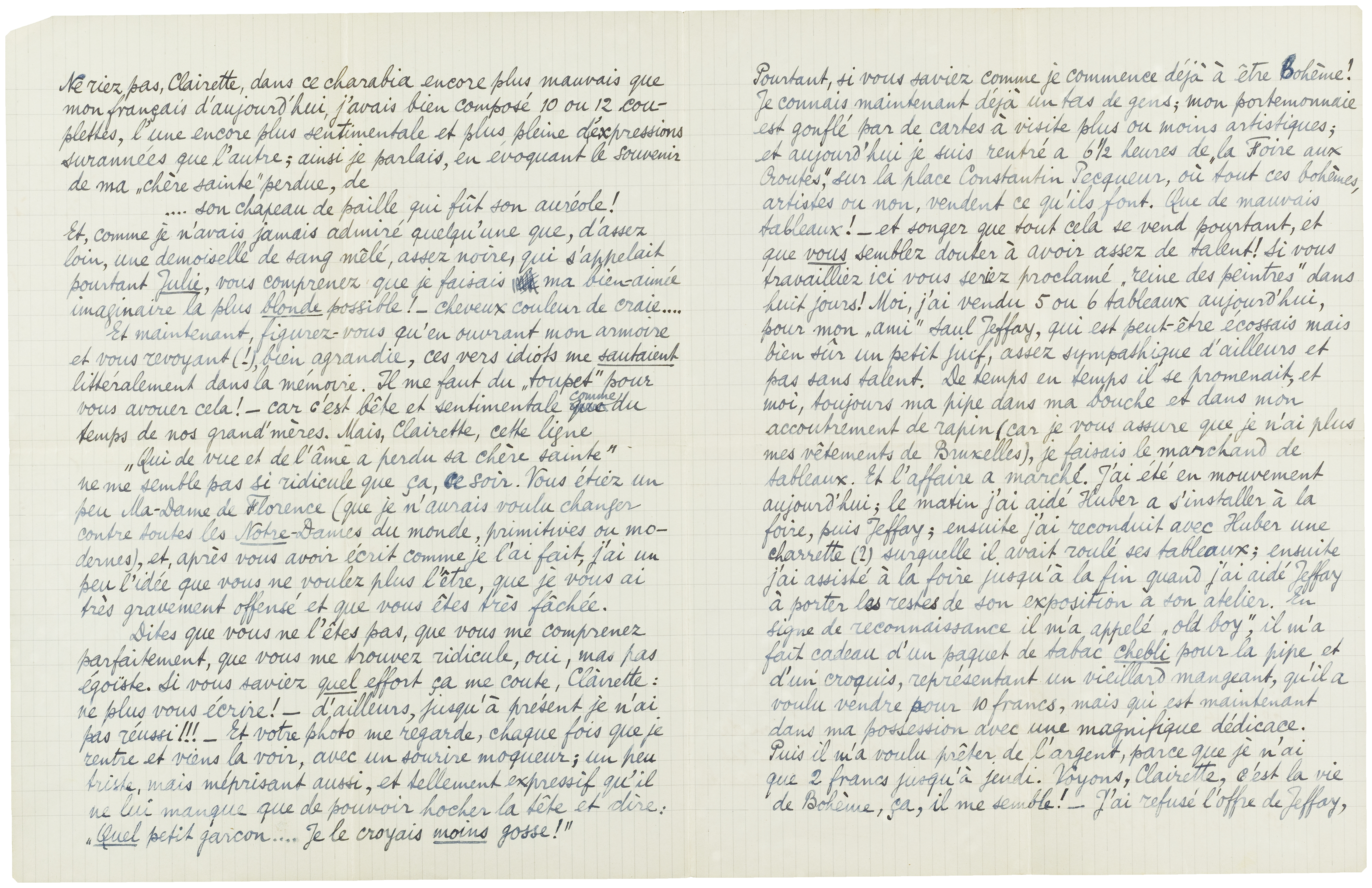 Pourtant, si vous saviez comme je commence déjà à être Bohème! Je connais maintenant déjà un tas de gens; mon portemonnaie est gonflé par de cartes à visite plus ou moins artistiques; et aujourd'hui je suis rentré a 6½ heures de la ‘Foire aux Croutes’, sur la place Constantin Pecqueur, où tout ces bohèmes, artistes ou non, vendent ce qu'ils font. Que de mauvais tableaux! - et songer que tout cela se vend pourtant, et que vous semblez douter à avoir assez de talent! Si vous travailliez ici vous seriez proclamé ‘reine des peintres’ dans huit jours! Moi, j'ai vendu 5 ou 6 tableaux aujourd'hui, pour mon ‘ami’ Saul Jeffay, qui est peutêtre écossais mais bien sûr un petit juif, assez sympathique d'ailleurs et pas sans talent. De temps en temps il se promenait, et moi, toujours ma pipe dans ma bouche et dans mon accoutrement de rapin (car je vous assure que je n'ai plus mes vêtements de Bruxelles), je faisais le marchand de tableaux. Et l'affaire a marché. J'ai été en mouvement aujourd'hui; le matin j'ai aidé Huber a s'installer à la foire, puis Jeffay; ensuite j'ai reconduit avec Huber une charrette (?) surquelle il avait roulé ses tableaux; ensuite j'ai assisté à la foire jusqu'à la fin quand j'ai aidé Jeffay à porter les restes de son exposition a son atelier. En signe de reconnaissance il m'a appelé ‘old boy’, il m'a fait cadeau d'un paquet de tabac chebli pour la pipe et d'un croquis, représentant un vieillard mangeant, qu'il a voulu vendre pour 10 francs, mais qui est maintenant dans ma possession avec une magnifique dédicace. Puis il m'a voulu prêter de l'argent, parce que je n'ai que 2 francs jusqu'à jeudi. Voyons, Clairette, c'est la vie de Bohème, ça, il me semble! - J'ai refusé l'offre de Jeffay, parce que j'avais payé d'avance mon logement et mon déjeuner d'une semaine, mais avouez que c'est sympathique de sa part. Dans le monde on ne se prête pas de l'argent après s'avoir connu un jour et on ne se dit pas: ‘Viens chez moi si tu n'as de quoi manger.’