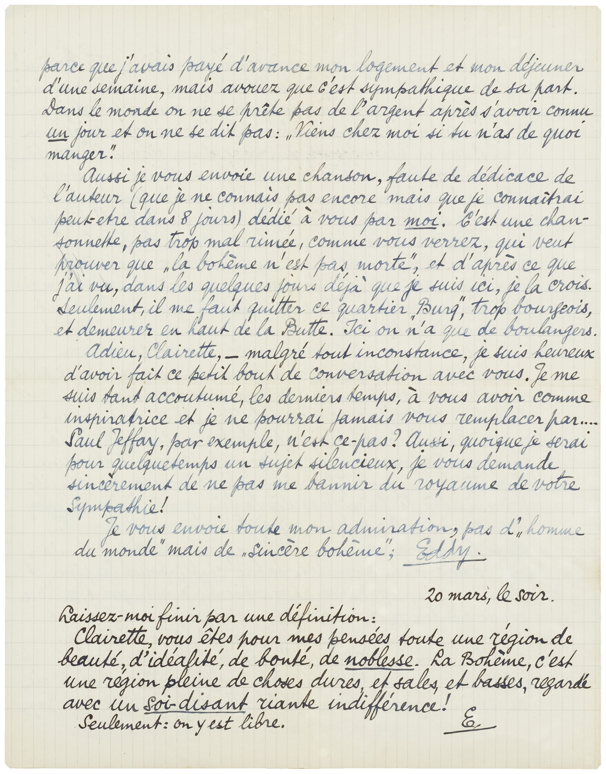 Clairette, vous êtes pour mes pensées toute une région de beauté, d'idéalité, de bonté, de noblesse. La Bohème, c'est une région pleine de choses dures, et sales, et basses, regardé avec un soi-disant riante indifférence!