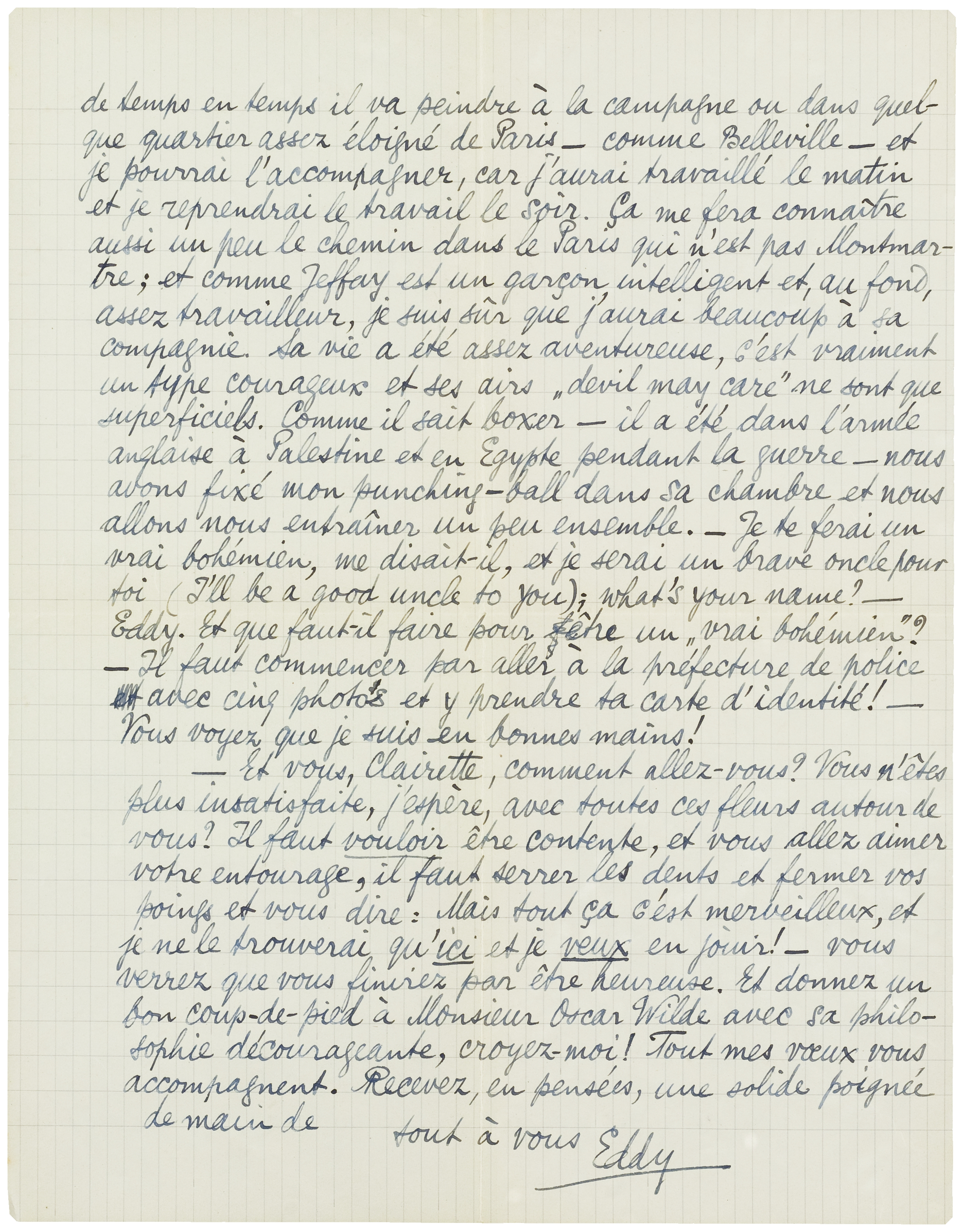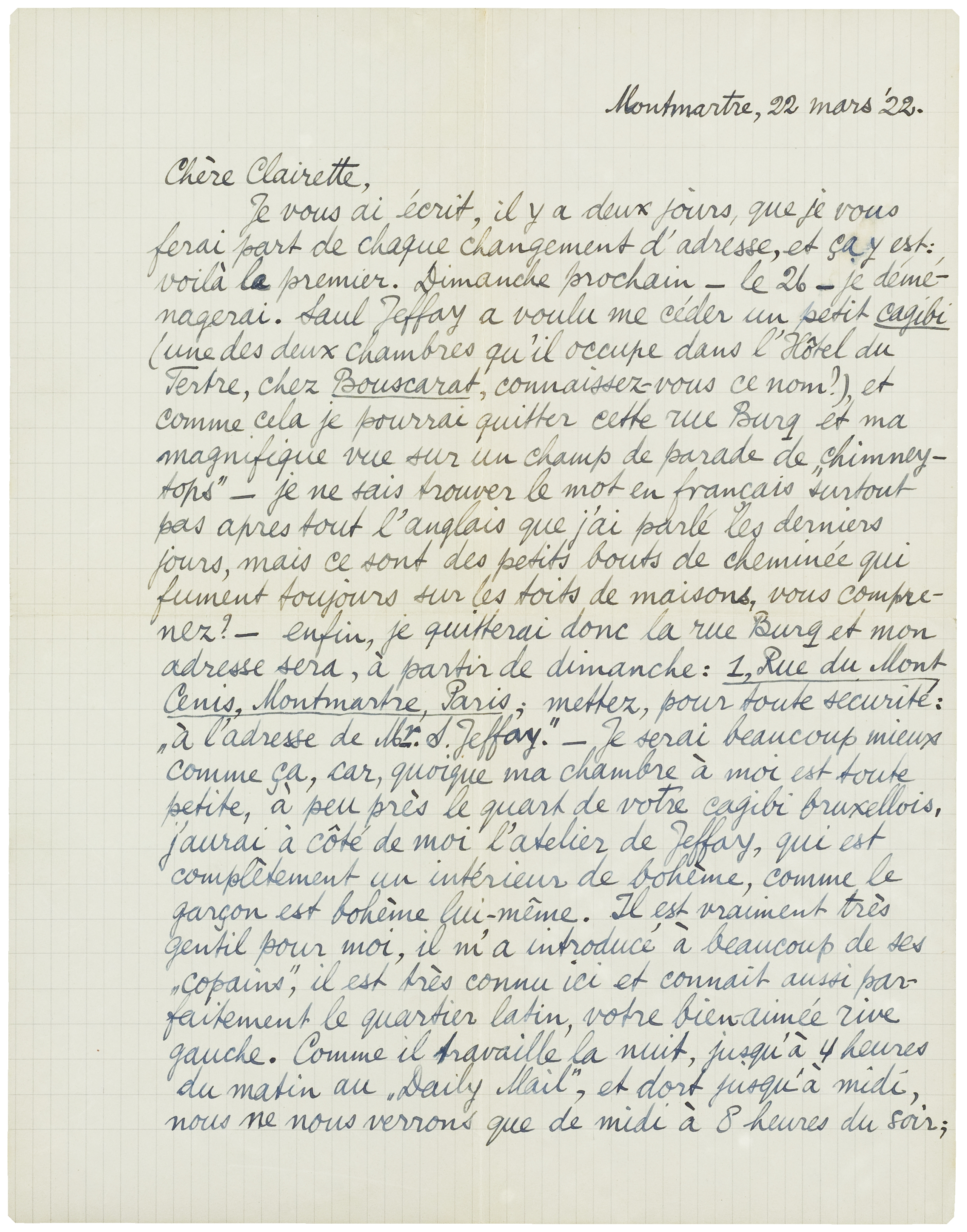 Je vous ai écrit, il y a deux jours, que je vous ferai part de chaque changement d'adresse, et ça y est: voilà le premier. Dimanche prochain - le 26 - je déménagerai. Saul Jeffay a voulu me céder un petit cagibi (une des deux chambres qu'il occupe dans l'Hôtel du Tertre, chez Bouscarat, connaissez-vous ce nom?), et comme cela je pourrai quitter cette rue Burq et ma magnifique vue sur un champ de parade de ‘chimney tops’ - je ne sais trouver le mot en français surtout pas apres tout l'anglais que j'ai parlé les derniers jours, mais ce sont des petits bouts de cheminée qui fument toujours sur les toits de maisons, vous comprenez? - enfin, je quitterai donc la rue Burq et mon adresse sera, à partir de dimanche: 1, Rue du Mont Cenis, Montmartre, Paris; mettez, pour toute securité: ‘à l'adresse de Mr. S. Jeffay’. - Je serai beaucoup mieux comme ça, car, quoique ma chambre à moi est toute petite, à peu près le quart de votre cagibi bruxellois, j'aurai à côté de moi l'atelier de Jeffay, qui est complètement un intérieur de bohème, comme le garçon est bohème lui-même. Il est vraiment très gentil pour moi, il m'a introducé à beaucoup de ses ‘copains’, il est très connu ici et connaît aussi parfaitement le quartier latin, votre bien-aimée rive gauche. Comme il travaille la nuit, jusqu'à 4 heures du matin au ‘Daily Mail’, et dort jusqu'à midi, nous ne nous verrons que de midi à 8 heures du soir; de temps en temps il va peindre à la campagne ou dans quelque quartier assez éloigné de Paris - comme Belleville - et je pourrai l'accompagner, car j'aurai travaillé le matin et je reprendrai le travail le soir. Ça me fera connaître aussi un peu le chemin dans le Paris qui n'est pas Montmartre; et comme Jeffay est un garçon intelligent et, au fond, assez travailleur, je suis sûr que j'aurai beaucoup à sa compagnie. Sa vie a été assez aventureuse, c'est vraiment un type courageux et ses airs ‘devil may care’ ne sont que superficiels. Comme il sait boxer - il a été dans l'armée anglaise à Palestine et en Egypte pendant la guerre - nous avons fixé mon punching-ball dans sa chambre et nous allons nous entraîner un peu ensemble. - Je ferai un vrai bohémien, me disait-il, et je serai un brave oncle pour toi (I'll be a good uncle to you); what's your name? - Eddy. Et que faut-il faire pour être un ‘vrai bohémien’? - Il faut commencer par aller à la préfecture de police avec cinq photos et y prendre ta carte d'identité! - Vous voyez que je suis en bonnes mains!