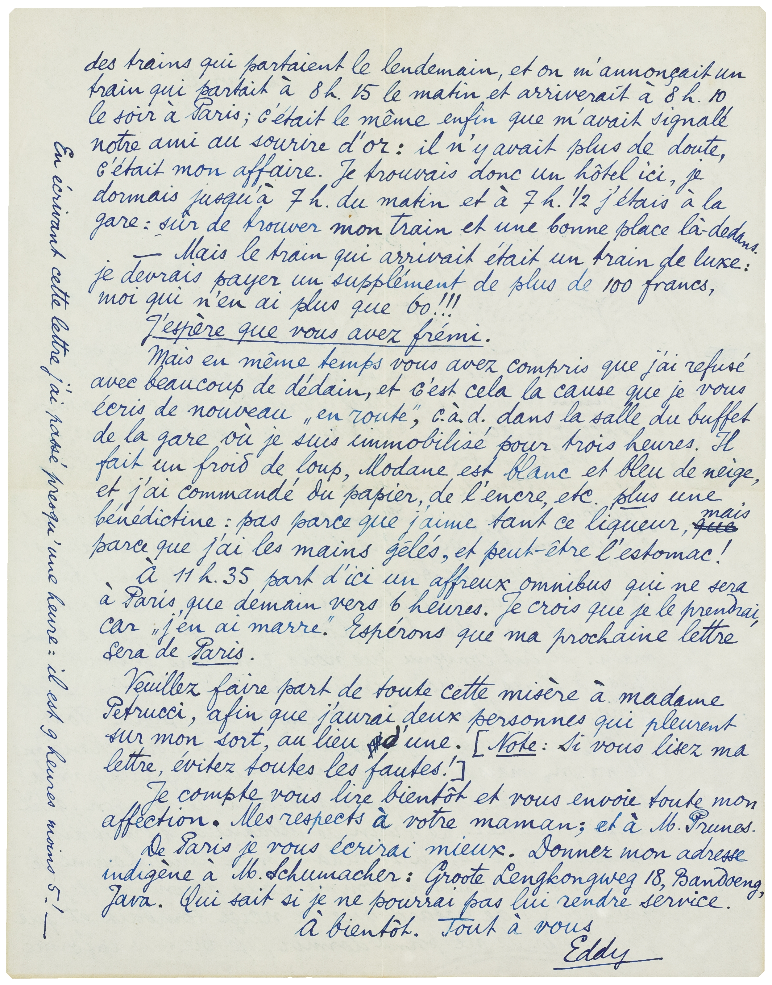 Mais en même temps que vous avez compris que j'ai refusé avec beaucoup de dédain, et c'est cela la cause que je vous écris de nouveau ‘en route’, c.à.d. dans la salle du buffet de la gare où je suis immobilisé pour trois heures. Il fait un froid de loup, Modane est blanc et bleu de neige, et j'ai commandé du papier, de l'encre, etc. plus une bénédictine: pas parce que j'aime tant ce liqueur, mais parce que j'ai les mains gélés, et peut-être l'estomac!