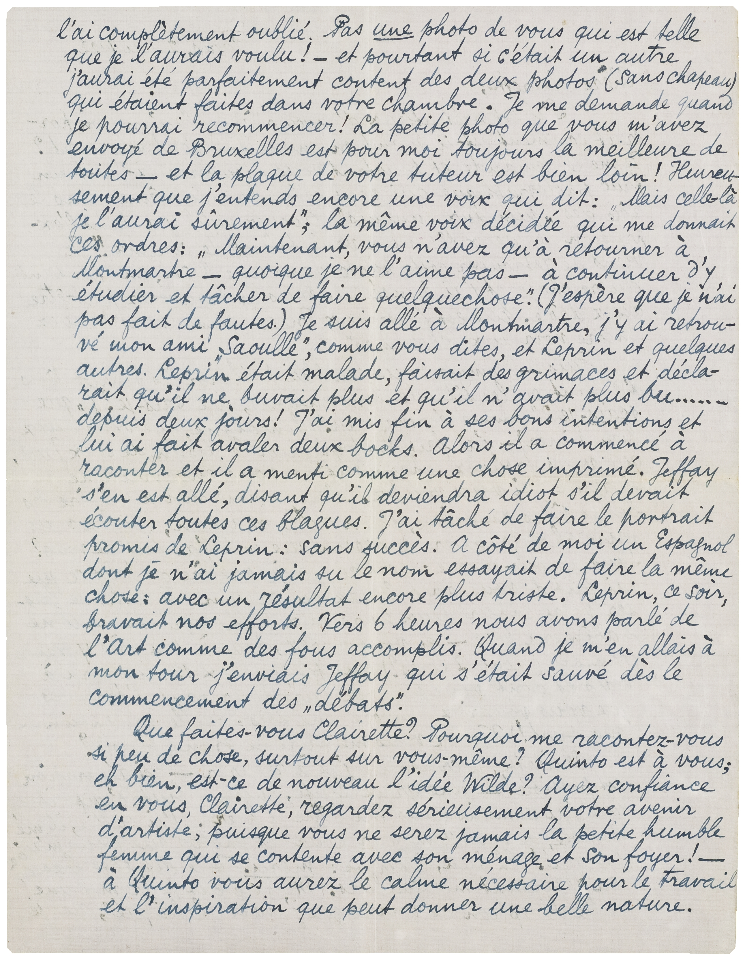 Clairette, je crois que j'ai à réparer - si réparation est possible! - une grave faute, puisque faute d'impolitesse, que j'ai commis dans ma lettre d'hier. J'ai oublié, il me semble, de vous remercier pour les photos que vous m'aviez envoyé! Eh bien, Clairette: merci. Je le dis, tête basse, en regardant mes souliers. Mais c'était pour moi une telle déception de voir ce que j'avais ‘fabriqué’, que je l'ai complètement oublié. Pas une photo de vous qui est telle que je l'aurais voulu! - et pourtant si c'était un autre j'aurai été parfaitement content des deux photos (sans chapeau) qui étaient faites dans votre chambre. Je me demande quand je pourrai recommencer! La petite photo que vous m'avez envoyé de Bruxelles est pour moi toujours la meilleure de toutes- et la plaque de votre tuteur est bien loin! Heureusement que j'entends encore une voix qui dit: ‘Mais celle-là je l'aurai sûrement’; la même voix décidée qui me donnait ces ordres: ‘Maintenant, vous n'avez qu'à retourner à Montmartre - quoique je ne l'aime pas - à continuer d'y étudier et tâcher de faire quelquechose.’ (J'espère que je n'ai pas fait de fautes.) Je suis allé à Montmartre, j'y ai retrouvé mon ami ‘Saoulle’, comme vous dites, et Leprin et quelque autres. Leprin était malade, faisait des grimaces et déclarait qu'il ne buvait plus et qu'il n'avait plus bu....... depuis deux jours! J'ai mis fin à ses bons intentions et lui ai fait avaler deux bocks. Alors il a commencé à raconter et il a menti comme une chose imprimé. Jeffay s'en est allé, disant qu'il deviendra idiot s'il devait écouter toutes ces blagues. J'ai tâché de faire le portrait promis de Leprin: sans succès. A côté de moi un Espagnol dont je n'ai jamais su le nom essayait de faire la même chose: avec un résultat encore plus triste. Leprin, ce soir, bravait nos efforts. Vers 6 heures nous avons parlé de l'Art comme des fous accomplis. Quand je m'en allais à mon tour j'enviais Jeffay qui s'était sauvé dès le commencement des ‘débats’.