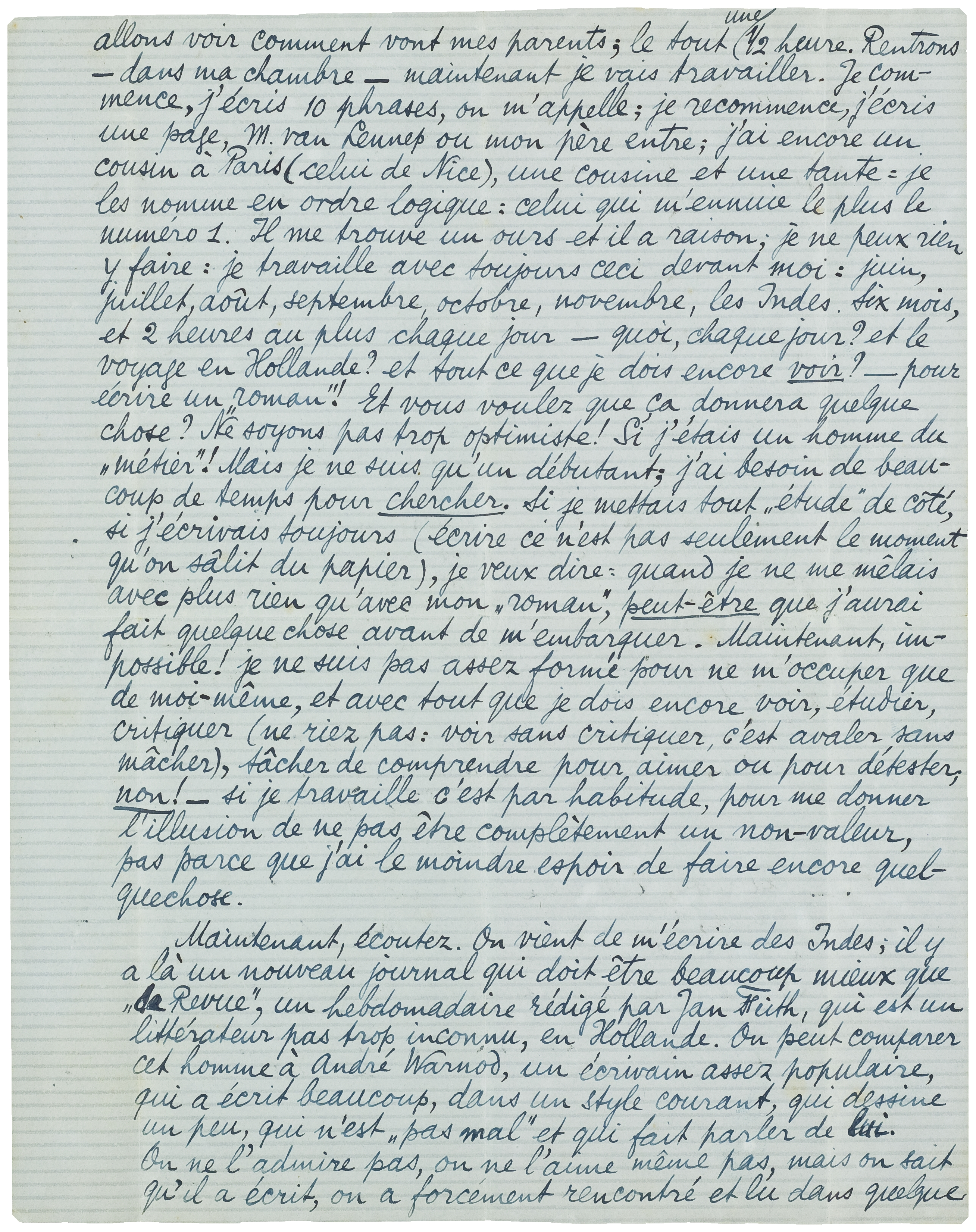 - Maintenant: on dine a 1 heure. De 8 à 1: 5 heures devant moi, 5 heures à remplir. J'ai à écrire une lettre: 1 heure; j'ai à lire: un chapitre sur Phidias, quelques vers de Rimbaud ou de Verlaine, la prose ‘moderne’ de Salmon ou de Max Jacob; mettons 1 heure: c'est déjà bien peu. Reste 3 heures - je dois m'habiller, il est assez tard. Maintenant, allons voir comment vont mes parents; le tout (½ heure. Rentrons - dans ma chambre - maintenant je vais travailler. Je commence, j'écris 10 phrases, on m'appelle; je recommence, j'écris une page, M. van Lennep ou mon père entre; j'ai encore un cousin à Paris (celui de Nice), une cousine et une tante: je les nomme en ordre logique: celui qui m'ennuie le plus le numéro 1. Il me trouve un ours et il a raison; je ne peux rien y faire: je travaille avec toujours ceci devant moi: juin, juillet, août, septembre, octobre, novembre, les Indes. Six mois, et 2 heures au plus chaque jour - quoi, chaque jour? et le voyage en Hollande? et tout ce que je dois encore voir? - pour écrire un ‘roman’! Et vous voulez que ça donnera quelque chose? Ne soyons pas trop optimiste! Si j'étais un homme du ‘métier’! Mais je ne suis qu'un débutant; j'ai besoin de beaucoup de temps pour chercher. Si je mettais tout ‘étude’ de côté, si j'écrivais toujours (écrire ce n'est pas seulement le moment qu'on sâlit du papier), je veux dire: quand je ne me mêlais avec plus rien qu'avec mon ‘roman’, peut-être que j'aurai fait quelque chose avant de m'embarquer. Maintenant, impossible! je ne suis pas assez formé pour ne m'occuper que de moi-même, et avec tout que je dois encore voir, étudier, critiquer (ne riez pas: voir sans critiquer, c'est avaler sans mâcher), tâcher de comprendre pour aimer ou pour détester, non! - si je travaille c'est par habitude, pour me donner l'illusion de ne pas être complètement un non-valeur, pas parce que j'ai le moindre espoir de faire encore quelquechose.