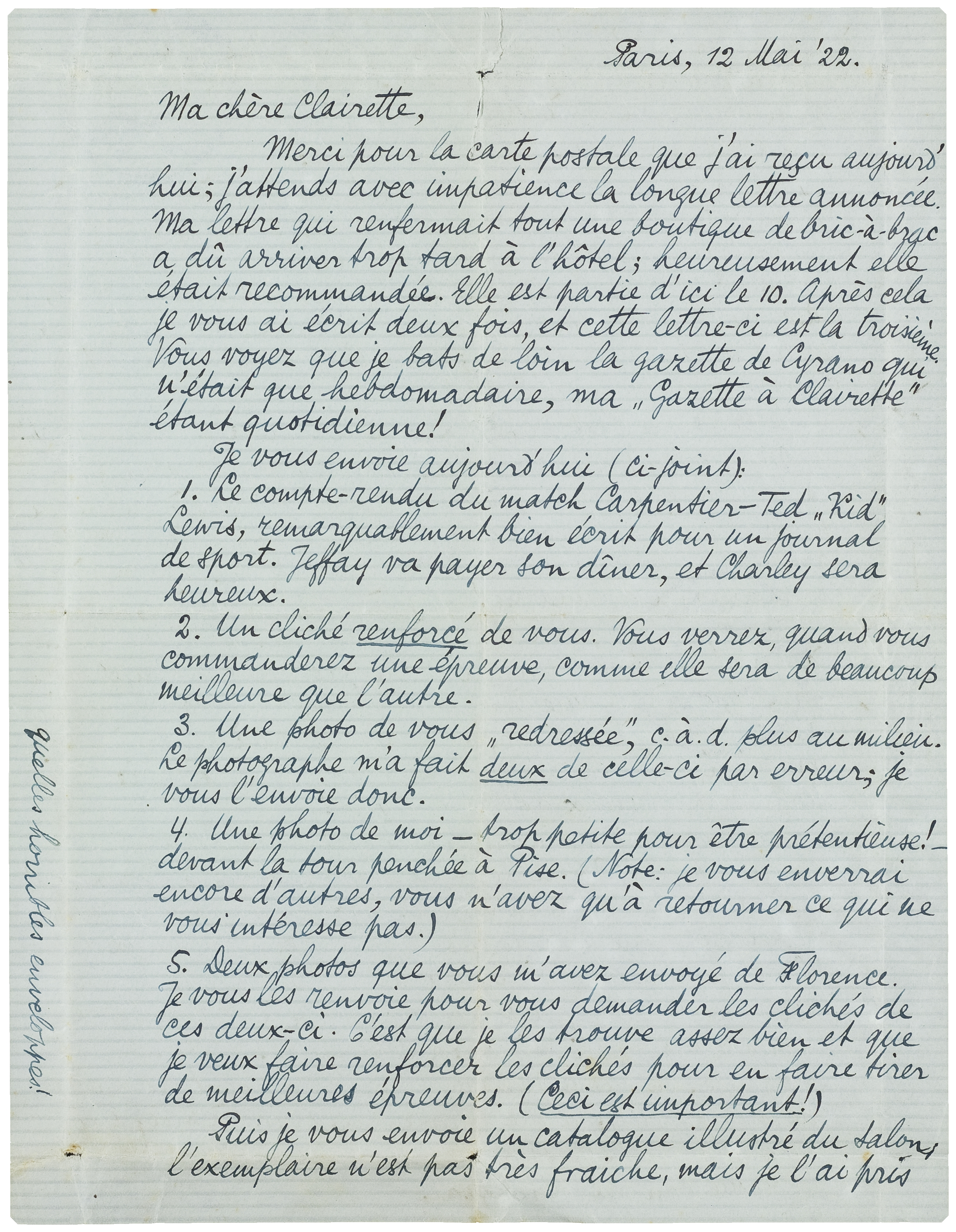 | 5. | Deux photos que vous m'avez envoyé de Florence. Je vous les renvoie pour vous demander les clichés de ces deux-ci. C'est que je les trouve assez bien et que je veux renforcer les clichés pour en faire tirer les meilleures épreuves. (Ceci est important!) |