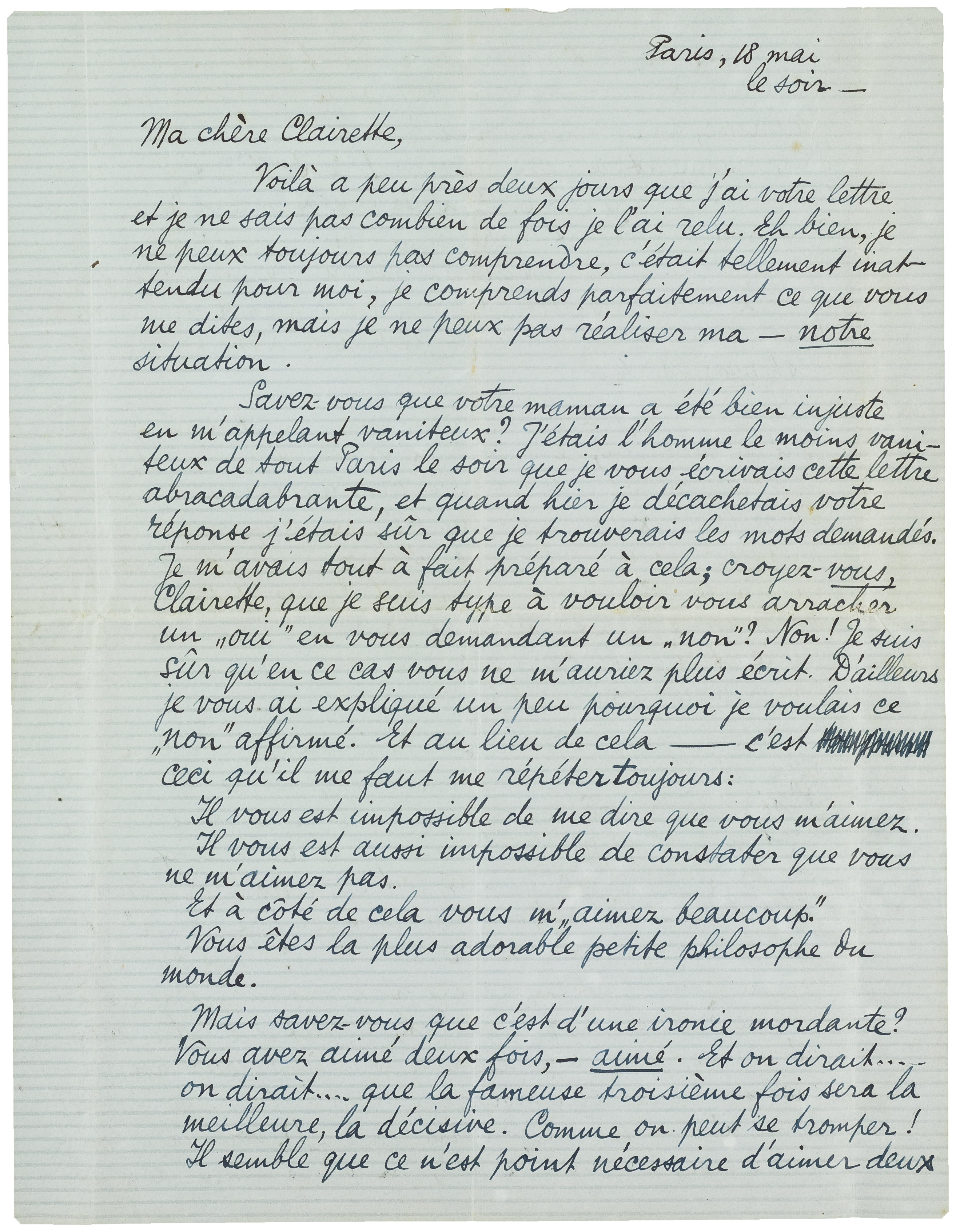 Savez-vous que votre maman a été bien injuste en m'appelant vaniteux? J'étais l'homme le moins vaniteux de tout Paris le soir que je vous écrivais cette lettre abracadabrante, et quand hier je décachetais votre réponse j'étais sûr que je trouverais les mots demandés. Je m'avais tout à fait préparé à cela; croyez-vous, Clairette, que je suis type à vouloir vous arracher un ‘oui’ en vous demandant un ‘non’? Non! Je suis sûr qu'en ce cas vous ne m'auriez plus écrit. D'ailleurs je vous ai expliqué un peu pourquoi je voulais ce ‘non’ affirmé. Et au lieu de cela - c'est ceci qu'il me faut me répéter toujours: