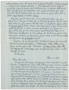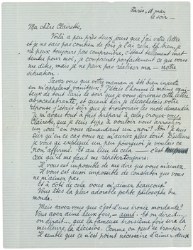 Je pense que je dois vous répondre et je ne le sais pas. Je n'en sais rien, je suis bien triste et pourtant, si vous saviez comme je vous suis reconnaissant pour tout les mots doux, pleins d'amitié, de (employons le mot!) presque-amour que vous m'avez écrit, et surtout pour la fin de votre lettre qui était brave et spontanée; je vous serre bien fermement la main pour cela, ma chère amie, et si vous croyez que je vous connais un peu, vous comprendrez comment je vous remercie.