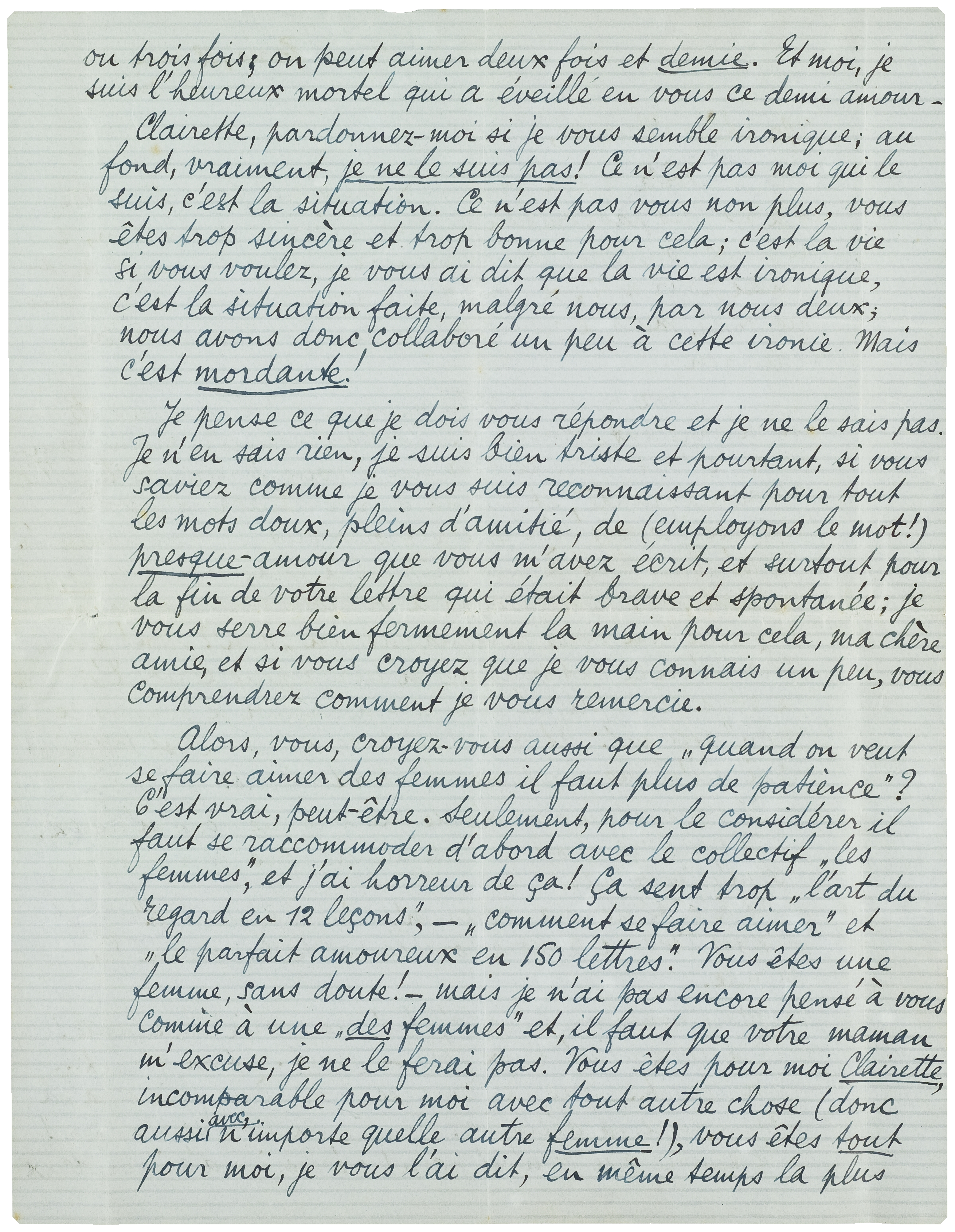 Clairette, pardonnez-moi si je vous semble ironique; au fond, vraiment, je ne le suis pas! Ce n'est pas moi qui le suis, c'est la situation. Ce n'est pas vous non plus, vous êtes trop sincère et trop bonne pour cela; c'est la vie si vous voulez, je vous ai dit que la vie est ironique, c'est la situation faite, malgré nous, par nous deux; nous avons donc collaboré un peu à cette ironie. Mais c'est mordante!