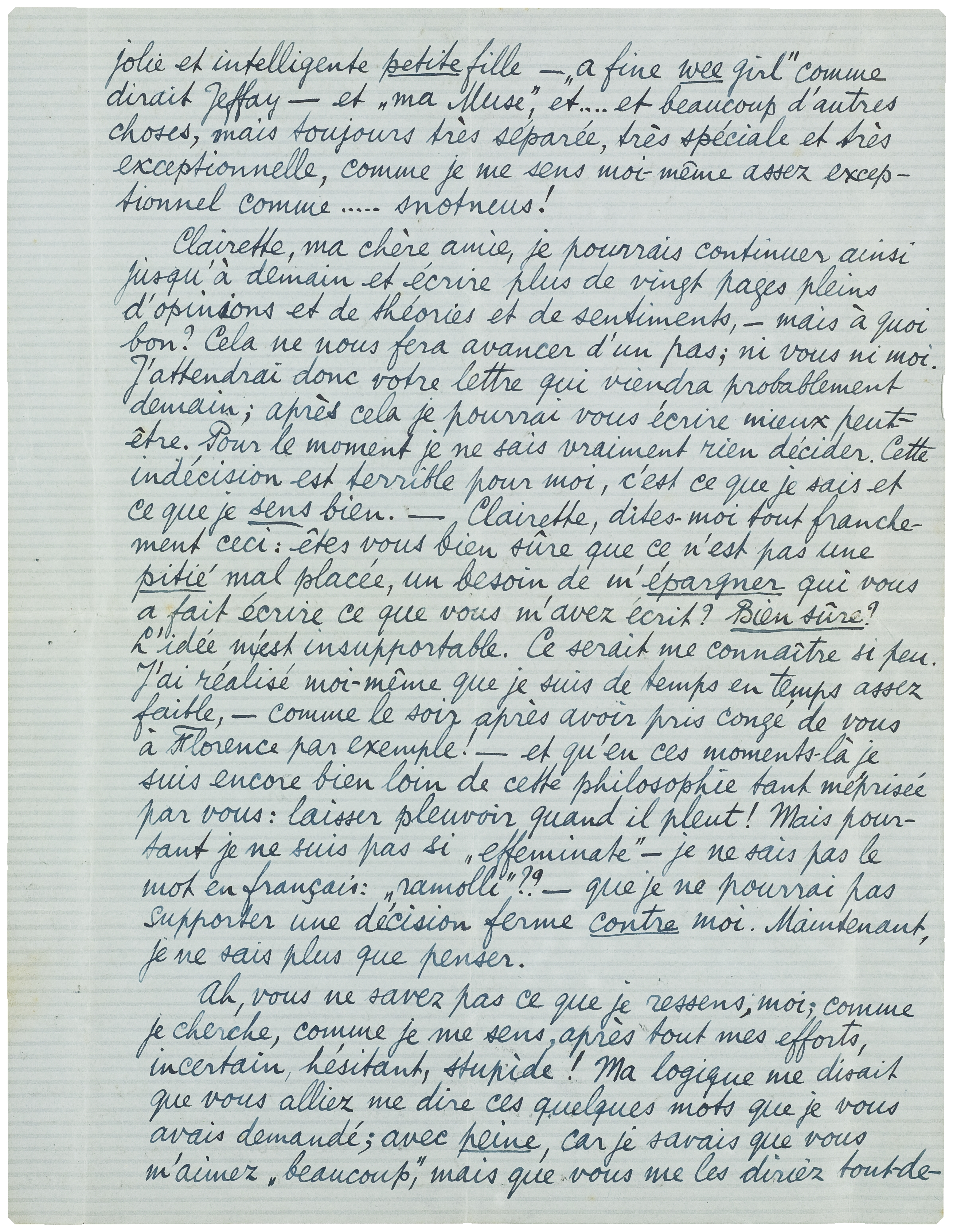 Clairette, ma chère amie, je pourrais continuer ainsi jusqu'à demain et écrire plus de vingt pages pleins d'opinions et de théories et de sentiments, - mais à quoi bon? Cela ne nous fera avancer d'un pas; ni vous ni moi. J'attendrai donc votre lettre qui viendra probablement demain; après cela je pourrai vous écrire mieux peut-être. Pour le moment je ne sais vraiment rien décider. Cette indécision est terrible pour moi, c'est ce que je sais et ce que je sens bien. - Clairette, dites-moi tout franchement ceci: êtes vous bien sûre que ce n'est pas une pitié mal placée, un besoin de m'épargner qui vous a fait écrire ce que vous m'avez écrit? Bien sûre? L'idée m'est insupportable. Ce serait me connaître si peu. J'ai réalisé moi-même que je suis de temps en temps assez faible, - comme le soir après avoir pris congé de vous à Florence par exemple! - et qu'en ces moments-là je suis encore bien loin de cette philosophie tant méprisée par vous: laisser pleuvoir quand il pleut! Mais pourtant je ne suis pas si ‘effeminate’- je ne sais pas le mot en français: ‘ramolli’?? - que je ne pourrai pas supporter une décision ferme contre moi. Maintenant, je ne sais plus que penser.