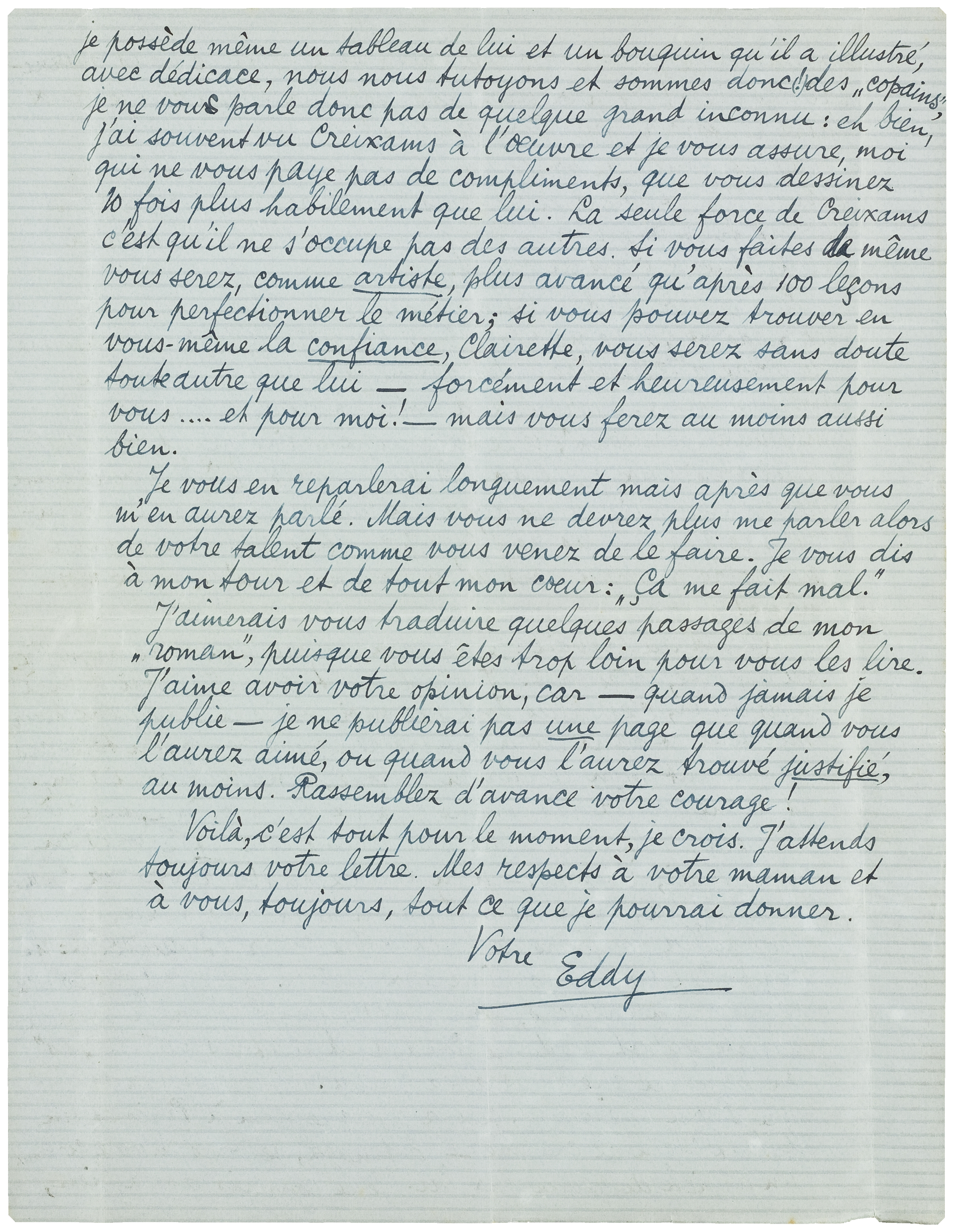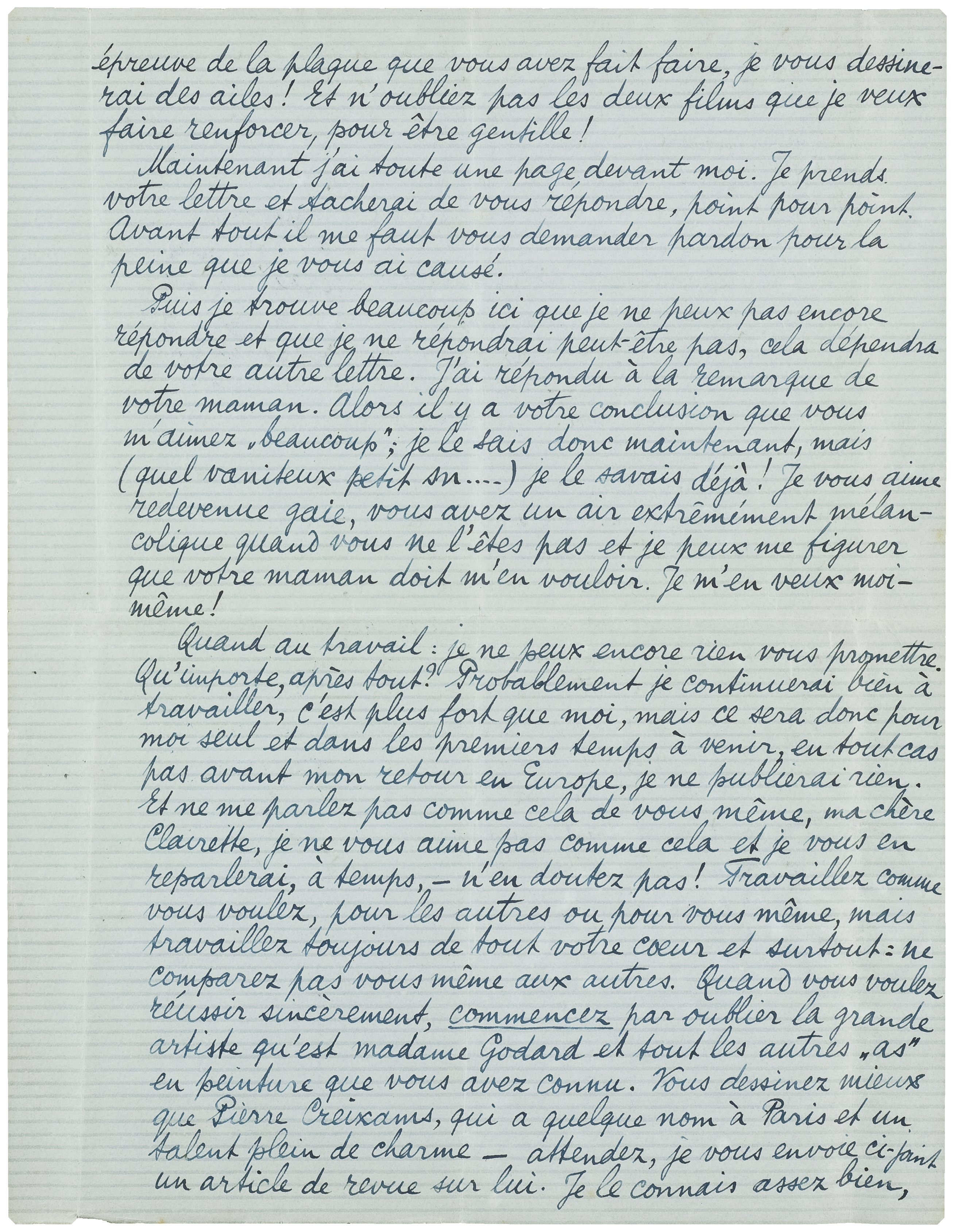 Quand au travail: je ne peux encore rien vous promettre. Qu'importe, après tout? Probablement je continuerai bien à travailler, c'est plus fort que moi, mais ce sera donc pour moi seul et dans les premiers temps à venir, en tout cas pas avant mon retour en Europe, je ne publierai rien. Et ne me parlez pas comme cela de vous même, ma chère Clairette, je ne vous aime pas comme cela et je vous en reparlerai, à temps,- n'en doutez pas! Travaillez comme vous voulez, pour les autres ou pour vous même, mais travaillez toujours de tout votre coeur et surtout: ne comparez pas vous même aux autres. Quand vous voulez réussir sincèrement, commencez par oublier la grande artiste qu'est madame Godard et tout les autres ‘as’ en peinture que vous avez connu. Vous dessinez mieux que Pierre Creixams, qui a quelque nom à Paris et un talent plein de charme - attendez, je vous envoie ci-joint un article de revue sur lui. Je le connais assez bien, je possède même un tableau de lui et un bouquin qu'il a illustré, avec dédicace, nous nous tutoyons et sommes donc (!) des ‘copains’, je ne vous parle donc pas de quelque grand inconnu: eh bien, j'ai souvent vu Creixams à l'oeuvre et je vous assure, moi qui ne vous paye pas de compliments, que vous dessinez 10 fois plus habilement que lui. La seule force de Creixams c'est qu'il ne s'occupe pas des autres. Si vous faites de même vous serez, comme artiste, plus avancé qu'après 100 leçons pour perfectionner le métier; si vous pouvez trouver en vous-même la confiance, Clairette, vous serez sans doute toute autre que lui - forcément et heureusement pour vous.... et pour moi! - mais vous ferez au moins aussi bien.
