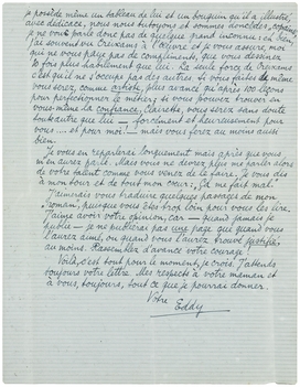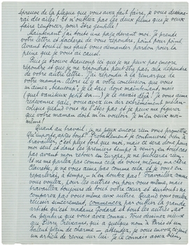 Voilà, c'est tout pour le moment, je crois. J'attends toujours votre lettre. Mes respects à votre maman et à vous, toujours, tout ce que je pourrai donner.