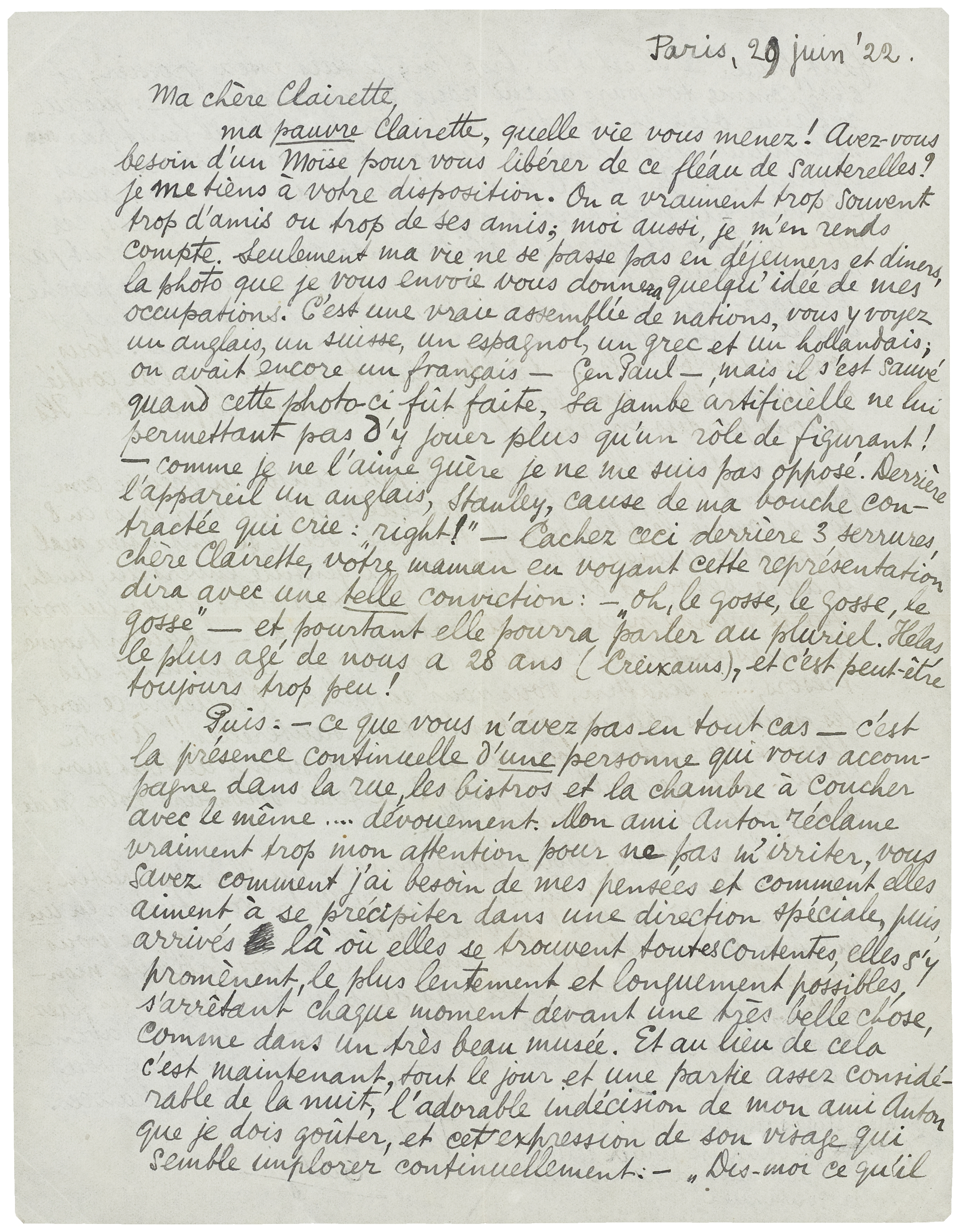 Je ne travaille plus, ou très peu. Anton m'occupe complètement (j'ai presque écrit: ‘obsède’). Il veut voir Paris en 8 jour comme le plus banal touriste. Ici il se sent assez mal à son aise, quoiqu'il en dise. Soyez gentille envers lui, lundi, il aura besoin d'être rassuré, j'en suis sûr; faites-lui voir que le monde n'est pas si grossier que ça! - et qu'on trouve de temps en temps certains cagibis qui renferment des trésors,..... ‘schatten’, vous vous rappelez? D'ailleurs ce sont les meilleurs champs où tombent les sauterelles!! A votre place je deviendrai fou. Aussi je vous plains de tout mon coeur. Vous ne voulez pas fuir? Je serai volontiers votre guide n'importe où vous voulez aller.