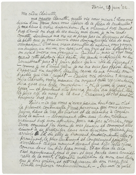 Puis: - ce que vous n'avez pas en tout cas - c'est la présence continuelle d'une personne qui vous accompagne dans la rue, les bistros et la chambre à coucher avec le même.... dévouement. Mon ami Anton réclame vraiment trop mon attention pour ne pas m'irriter, vous savez combien j'ai besoin de mes pensées et comment elles aiment à se précipiter dans une direction spéciale, puis, arrivés là où elles se trouvent toutes contentes, elles s'y promènent, le plus lentement et longuement possibles, s'arrêtant chaque moment devant une très belle chose, comme dans un très beau musée. Et au lieu de cela c'est maintenant tout le jour et une partie assez considérable de la nuit, l'adorable indécision de mon ami Anton que je dois goûter, et cet expression de son visage qui semble implorer continuellement: - ‘Dis-moi ce qu'il faut faire.’ - Il est très, trop fin; je suis assez grossier; et c'est comme toujours quand nous sommes ensemble: quoique je l'aime bien et considère toutes ses qualités, il finit par m'ennuyer profondément surtout dans mes circonstances actuelles. - Je vous le présenterai, lundi. Il se peut aussi très bien que nous serons déjà dimanche à Bruxelles, car notre argent disparait rapidement; comme on ne peut pas manger pour 7 lires à Paris je prévois une fin très proche. Figurez-vous que c'est moi qui économise maintenant, et qui le gronde quand il dépense 10 frs à des livres. Nous sommes inséparables, - très touchant. Une fois je l'ai confié à Duboux pour une promenade à la tour Eiffel, etc. - Ils se sont perdus en route!